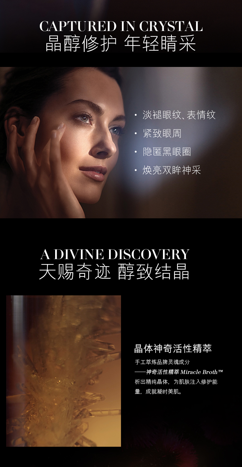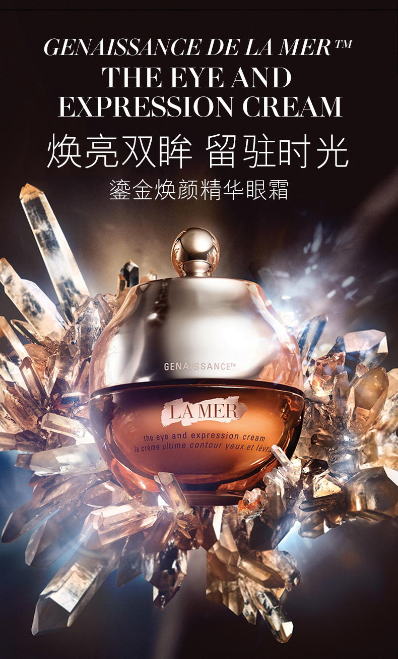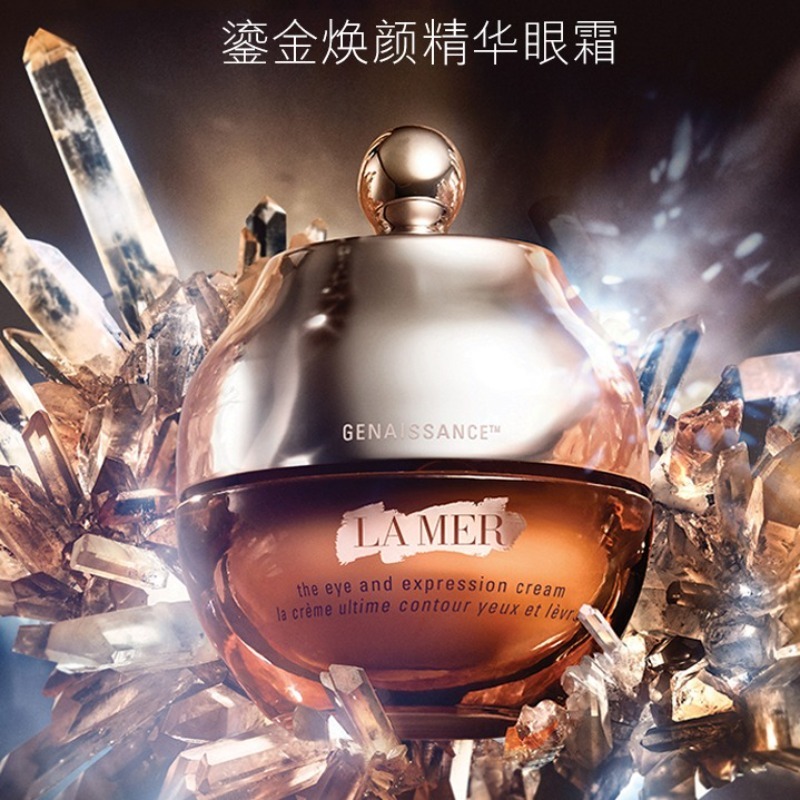 海蓝之谜鎏金焕颜精华眼霜超越时间痕迹。修护保湿成分即刻使激活眼部肌肤。每日使用,调理肌肤,更显提拉紧致。浮肿、细纹、黑眼圈、压力表现、疲劳和岁月痕迹消失殆尽。脸部表情区域,如额头和笑纹,最易显出衰老,这部分肌肤更充盈丰满。细纹减少,表情区域更显提拉。