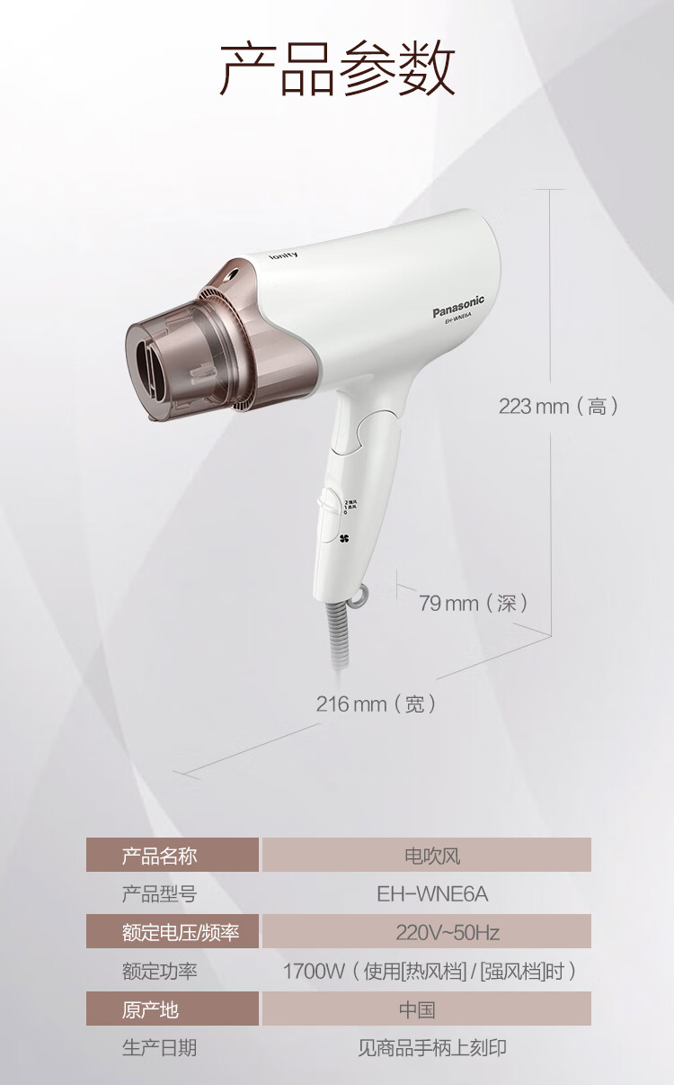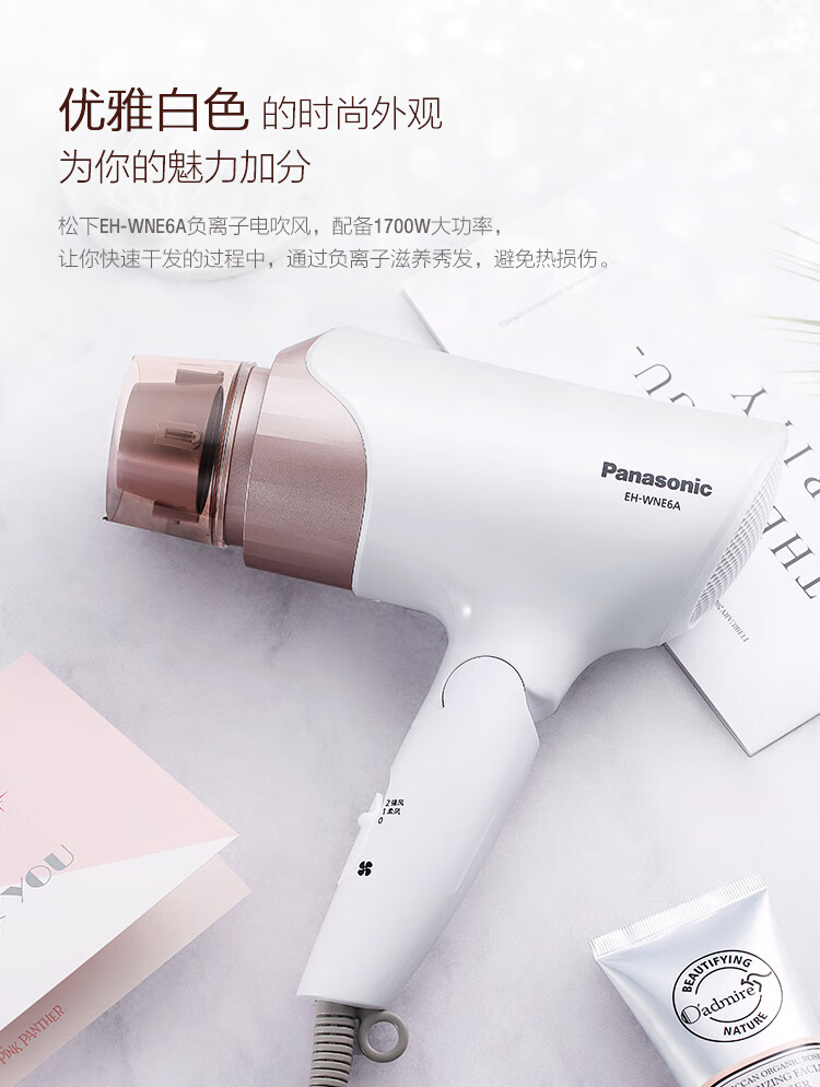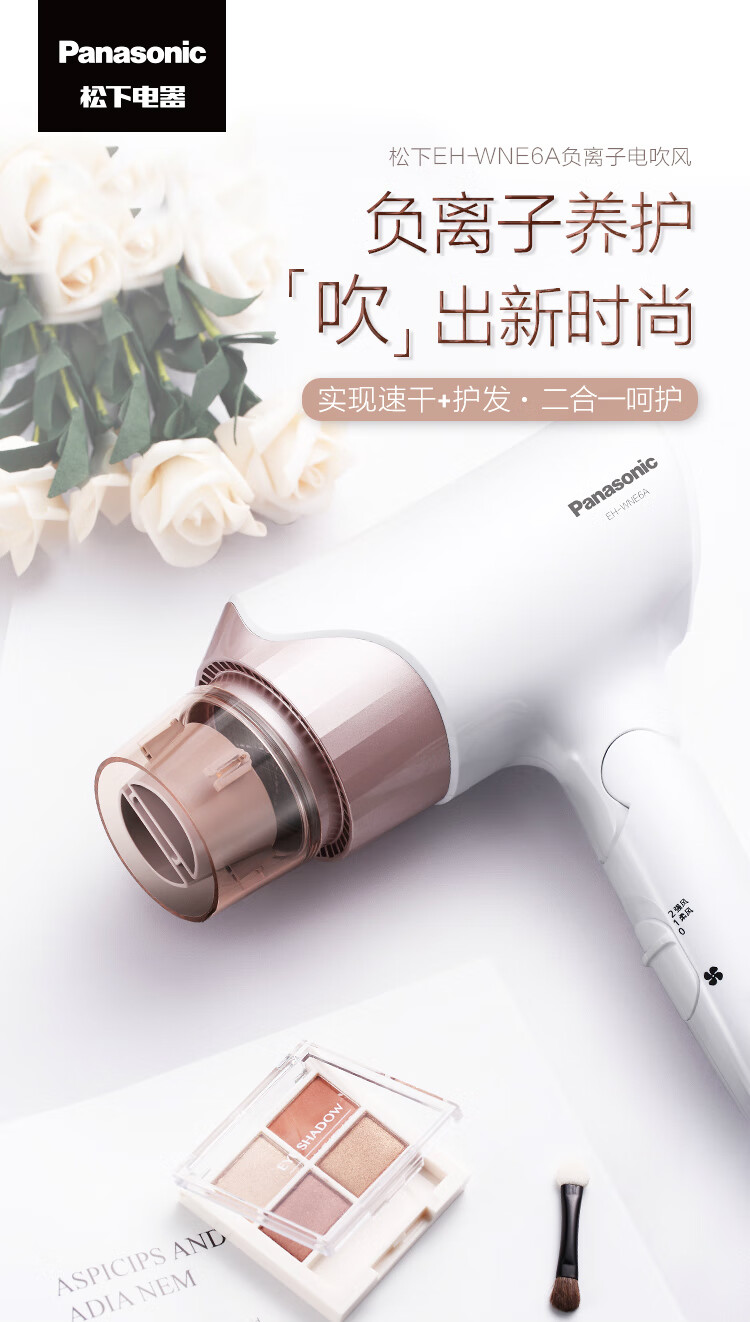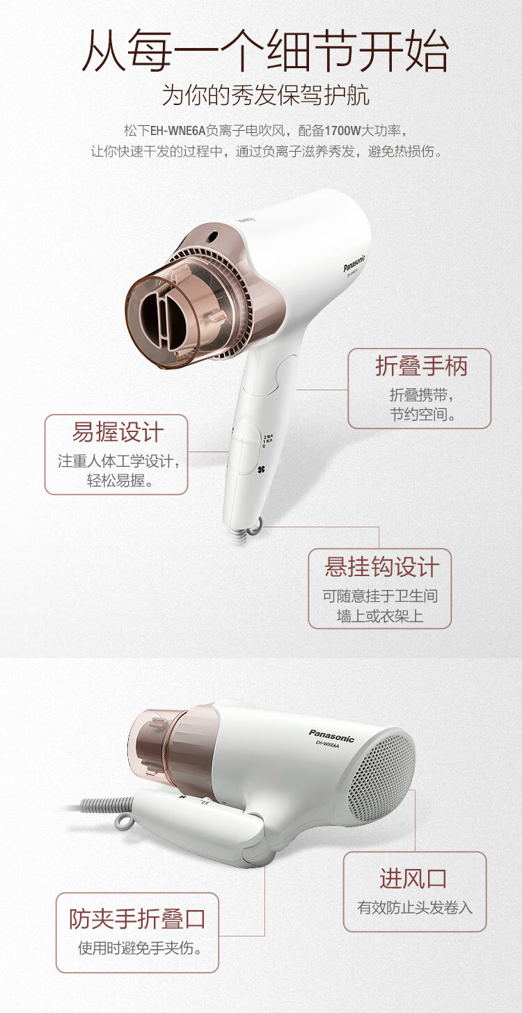 松下(Panasonic)电吹风 家用大功率电吹风筒 高速大风力速干 折叠便携 负离子护发 EH-WNE6A