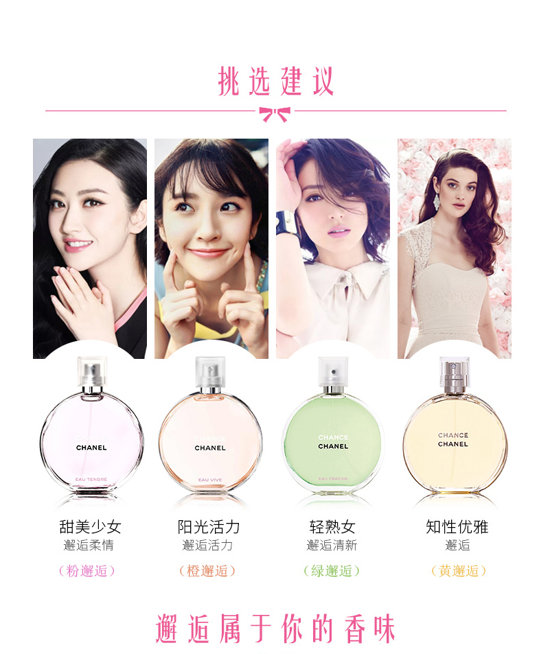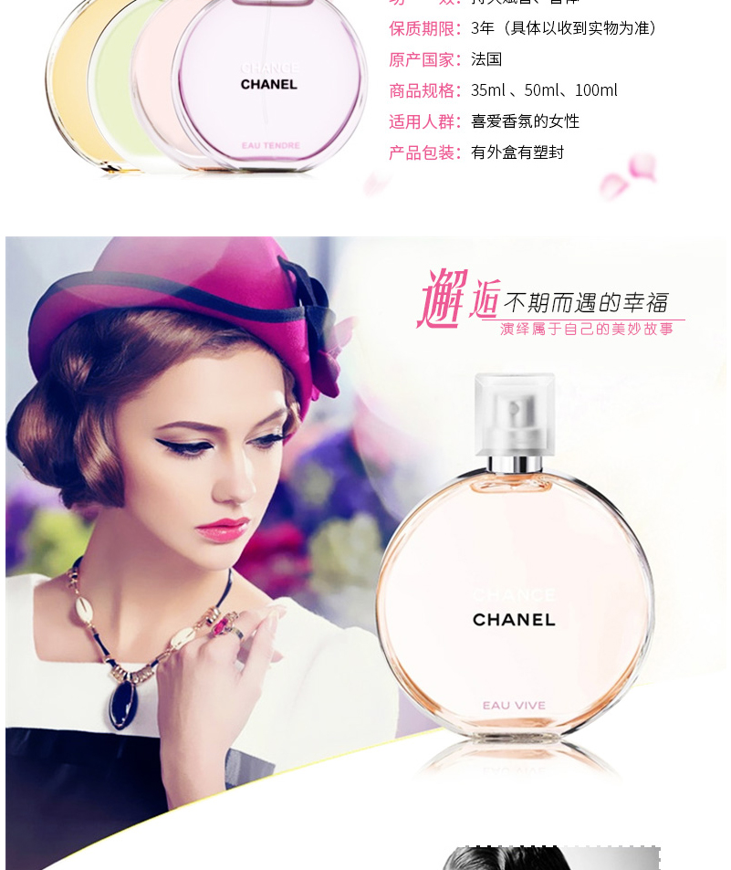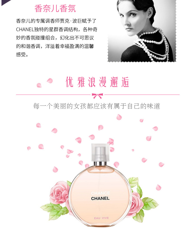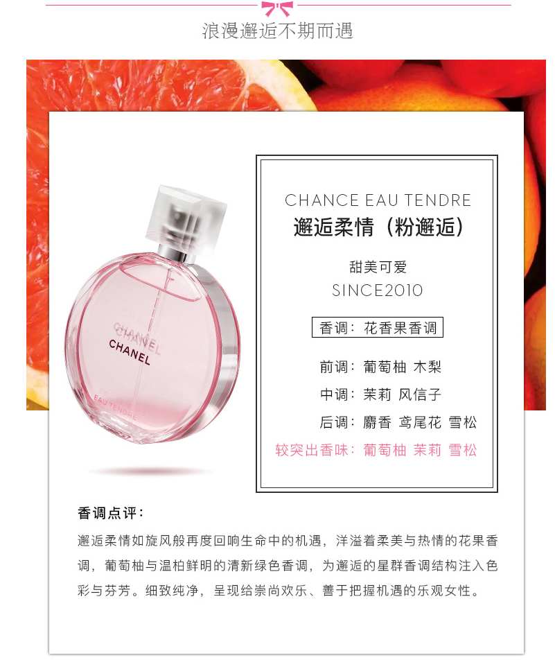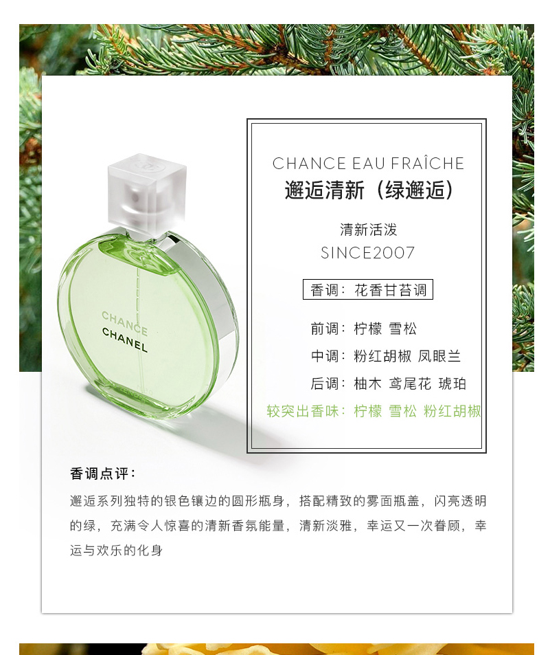 规格50ml。香奈儿邂逅香水以清新花香为主调,充分表现时代女性充满活力及勇敢果断的一面。圆形瓶身的香水。圆,象征着命运之轮,引领我们进入那旋转不息的世界。