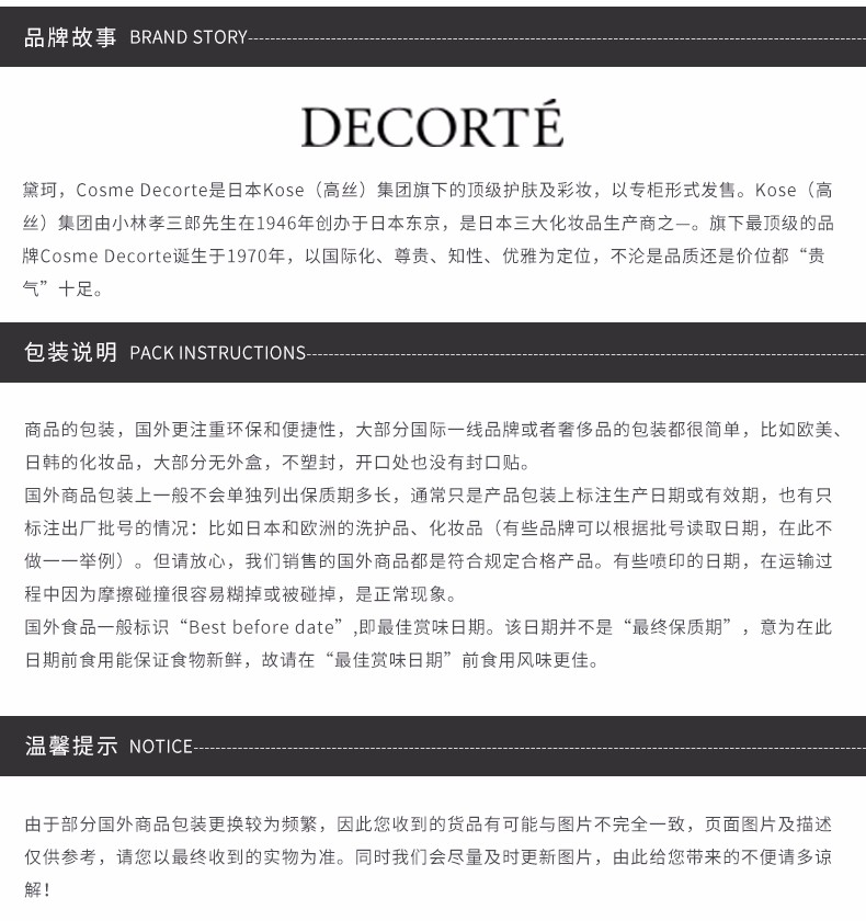 黛珂,Cosme Decorte是日本Kose(高丝)集团旗下的顶级护肤及彩妆,以专柜形式发售。Kose(高丝)集团由小林孝三郎先生在1946年创办于日本东京,是日本三大化妆品生产商之—。