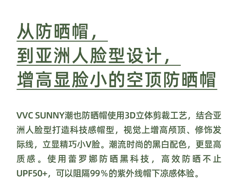 VVC,创立于2014年,以一顶“空顶帽"大单品引爆市场,作为行业首创,成为服饰防晒帽类目新晋黑马。10余年深耕功能性布料研发,专注科技防晒。完成了由「养肤防晒服饰」到「全线功能服饰」的转型,2023年稳居线上平台户外榜单抖音TOP1,京东TOP1,天猫TOP2,防晒服饰全网累计销量高达15000000+件2024年VVC品牌战略升级,以“兼具科学防护与包容舒适的城市户外品牌“的品牌定位将重新定义功能性服饰新赛道。