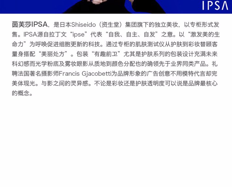 茵芙莎IPSA,是日本Shiseido(资生堂)集团旗下的独立美妆,以专柜形式发售。IPSA源自拉丁文“ipse”代表“自我、自主、自发”之意。以“激发美的生命力”为呼唤促进细胞更新的科技。通过专柜的肌肤测试仪从护肤到彩妆替顾客量身搭配“美丽处方”。包装“有趣前卫”尤其是护肤系列的包装设计充满未来科幻感而光学粉底及雾妆眼影从质地到颜色分配也的确领先于业界同类产品。礼聘法国著名摄影师