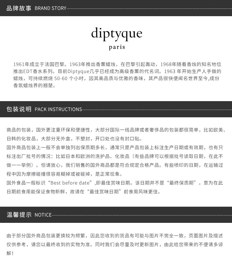 蒂普提克品牌,英文名Diptyque,自创办以来,蒂普提克品牌以诚信、共赢、开创经营理念,创造良好的企业环境,力求为每一个客户提供最优质品质和完美的服务。蒂普提克专业生产销售香根草,香熏蜡烛,水烟炭,浴油,香薰蜡烛,香熏器,香氛蜡烛,中性香水,洁手液,啫喱水,直购,玫瑰水,熏香器,法国香水,精油香皂,精油皂,沐浴液,啫喱膏,沐浴油,香水淡香等产品。
