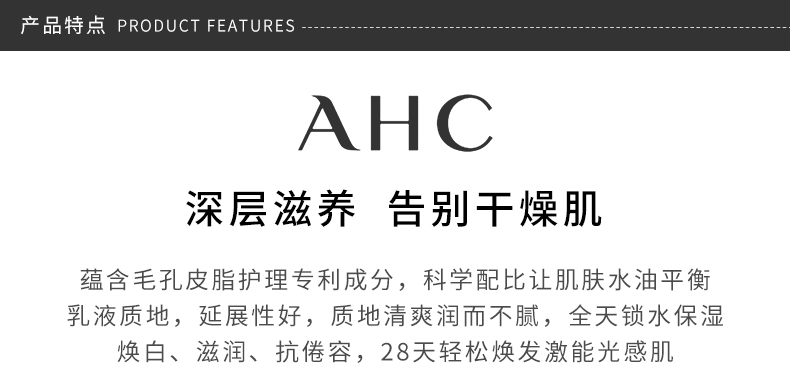 AHC是隶属于韩国Carver Korea(珂泊亚)化妆品集团,为韩国美容专业线高端品牌,也是功效性化妆品牌,核心价值就是帮助女性寻找专属于自己的美丽,传递幸福。