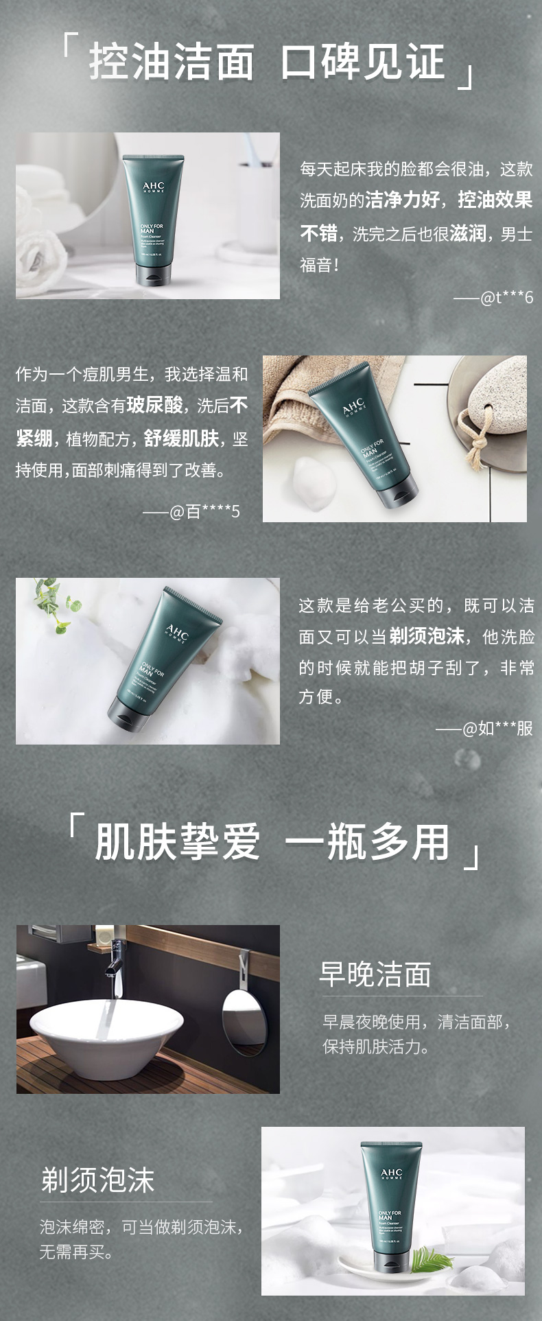 主打:深层清洁,温和清爽 每次用量一硬币大小,含有玻尿酸成分可以当男性剃须泡沫,还可以修复抗痘去除黑头。洗完后,脸部清爽舒适,不假滑,不拔干,不紧绷,敏感肌痘痘肌都可以使用。