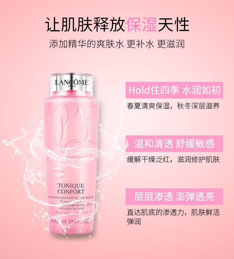 兰蔻明星保湿单品,补水滋养不间断;温和质地,玫瑰香气,呵护脆弱肌肤;散发着淡淡的清新玫瑰香味,让人产生愉悦感;粉红色的稀薄乳液质地,可以让肌肤吸收;而且每次只需一点点,就可以滋润整个面部,持续使用,肌肤变得如玫瑰花般紧实润泽,并且富有弹性
