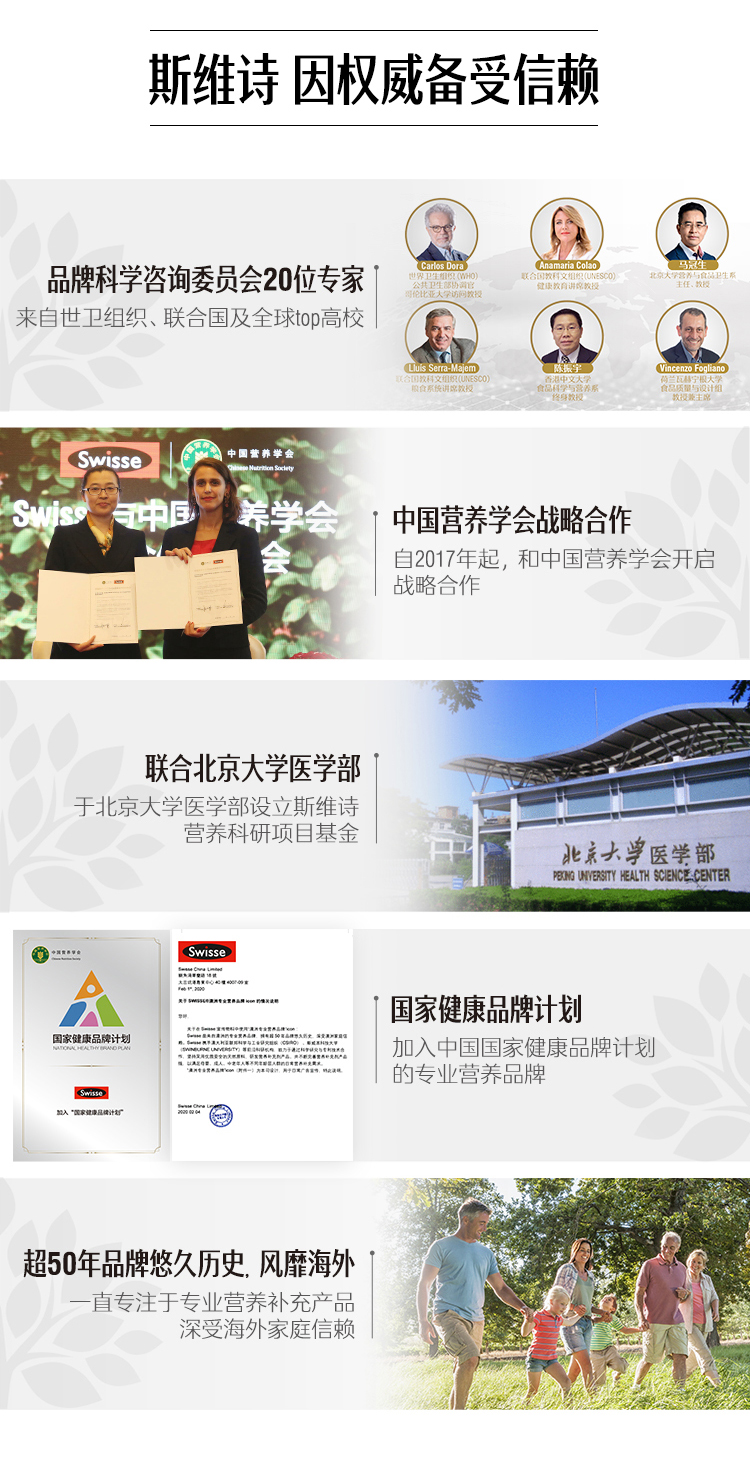 Swisse是一个全球性的专业营养品牌,由Kevin Ring于1969年在澳大利亚墨尔本创立。该品牌致力于研发结合现代科学认证和传统有效经验的产品,旨在让全世界人们生活得更健康、更快乐。Swisse的产品线非常丰富,包括美容养颜、益生菌类、运动健康、骨骼健康等多个产品大类,以满足不同年龄和性别人群的需求。品牌的产品原料多来源于各种植物,添加剂较少,因此相对安全,适合包括孕妇、老人和小孩在内的各类人群使用。