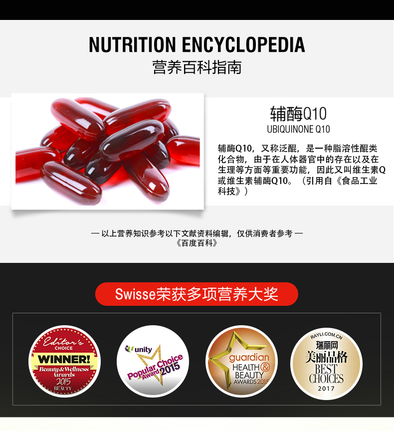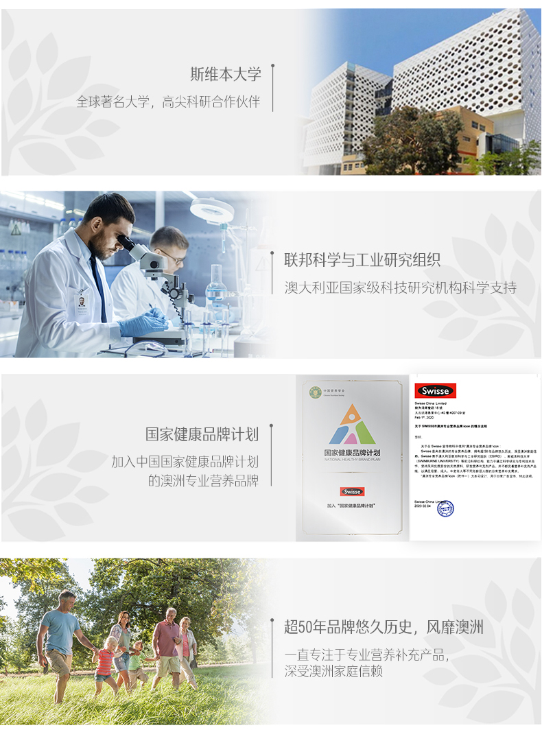 Swisse是一个全球性的专业营养品牌,由Kevin Ring于1969年在澳大利亚墨尔本创立。该品牌致力于研发结合现代科学认证和传统有效经验的产品,旨在让全世界人们生活得更健康、更快乐。Swisse的产品线非常丰富,包括美容养颜、益生菌类、运动健康、骨骼健康等多个产品大类,以满足不同年龄和性别人群的需求。品牌的产品原料多来源于各种植物,添加剂较少,因此相对安全,适合包括孕妇、老人和小孩在内的各类人群使用。