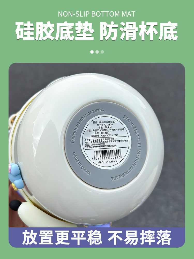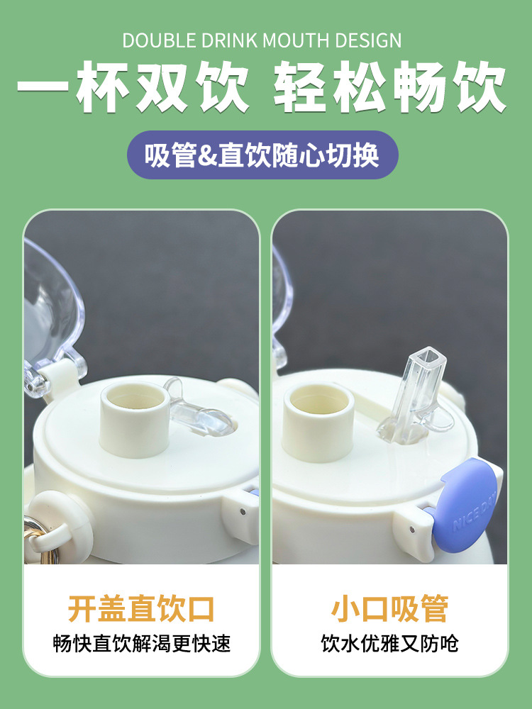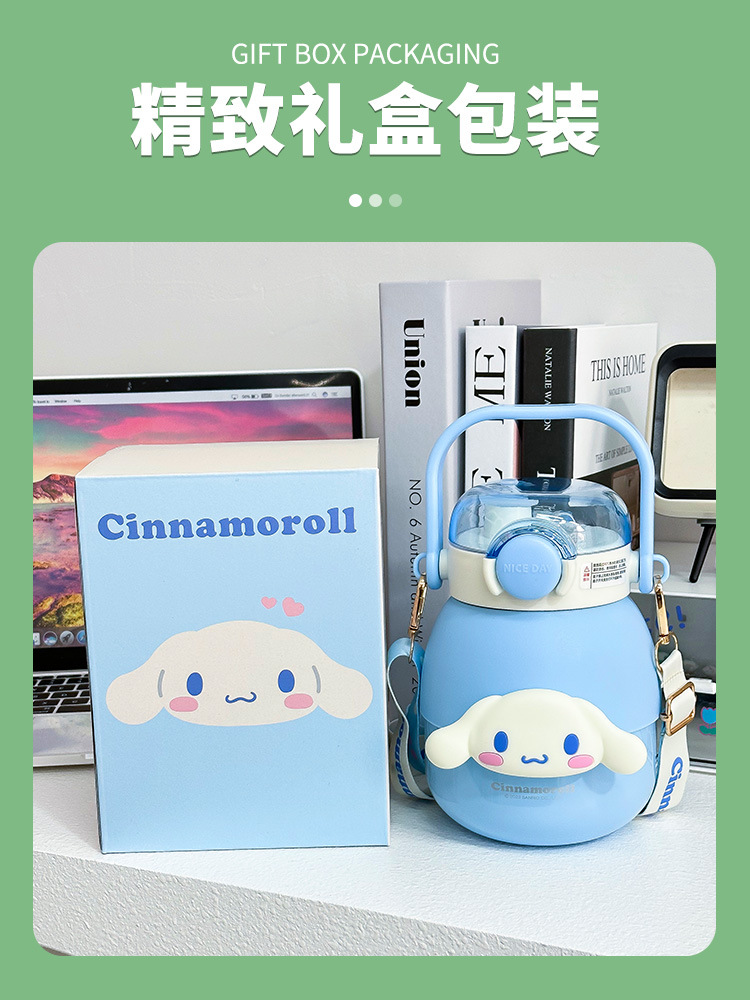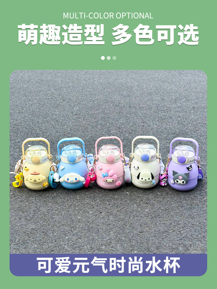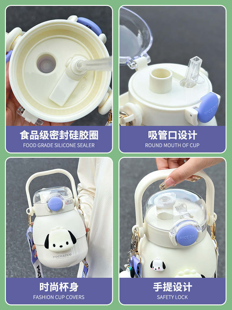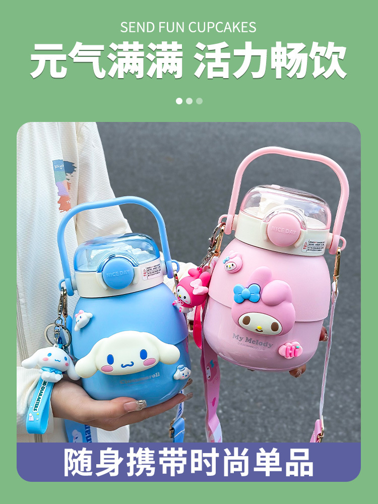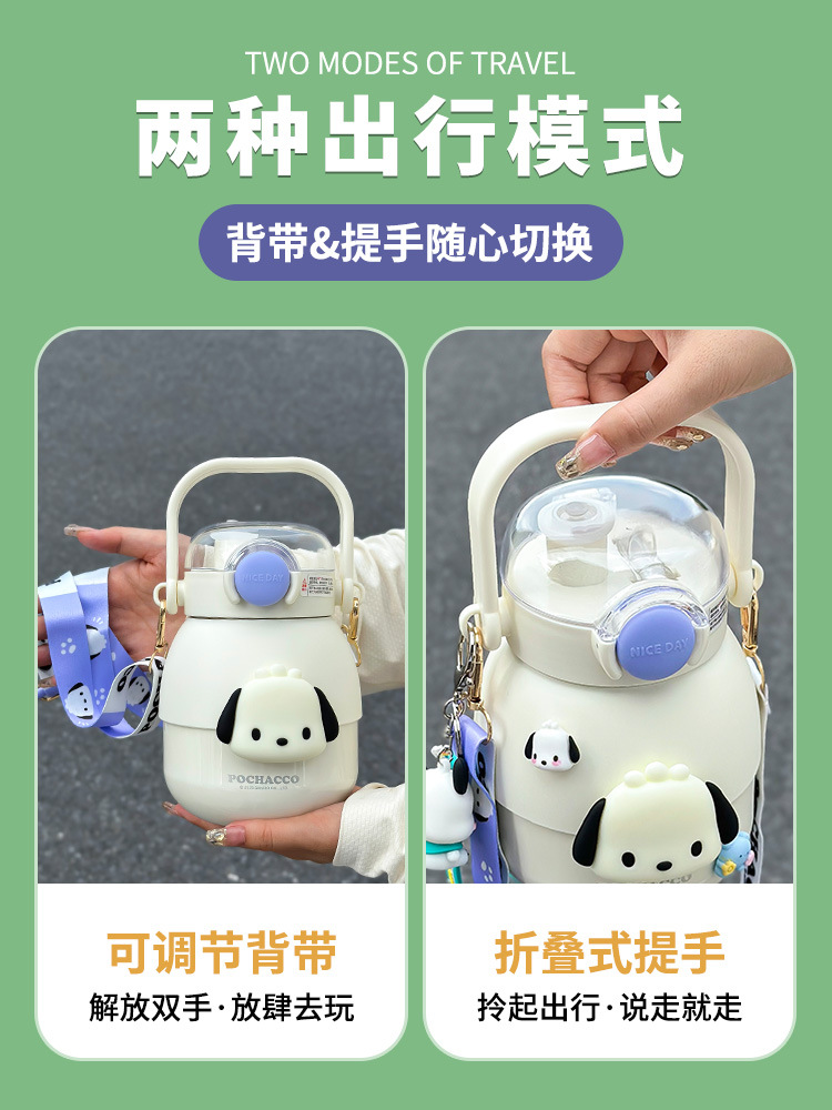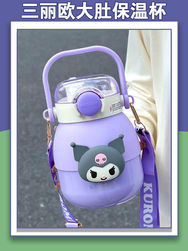 初和三丽欧库洛米水杯学生316不锈钢儿童保温杯大肚杯子户外双饮吸管杯880ml