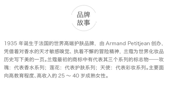 兰蔻1935年诞生于法国,是由Armand Petitjean(阿曼达·珀蒂让)创办的品牌。作为全球知名的高端化妆品品牌,兰蔻涉足护肤、彩妆、香水等多个产品领域,主要面向教育程度、收入水平较高,年龄在25~40岁的成熟女性 。2018年12月,世界品牌实验室发布《2018世界品牌500强》榜单,兰蔻排名第494。