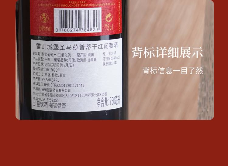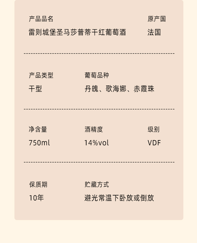 法国进口雷则城堡14度美酒圣马莎普蒂干红葡萄酒750ml/瓶 红色喜庆包装宴请送礼