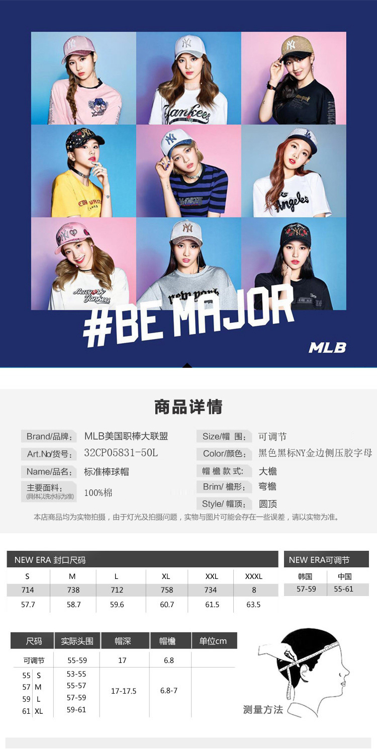 MLB帽子女男泫雅同款老花棒球帽运动帽男鸭舌帽32CPFB911-50I