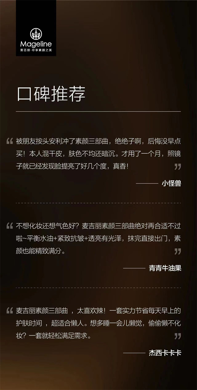 麦吉丽,倡导“尽享素颜之美”的护肤理念,麦吉丽逆时光系列现已全新上市。旗下产品涵盖护肤、面膜、彩妆、美容饮品等方面,帮助千万女性解决肌肤问题,重拾素颜之美的自信!