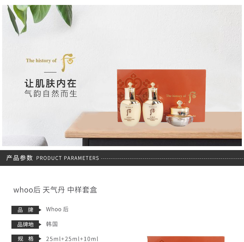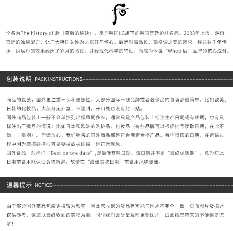 LG集团子公司LG生活健康旗下的化妆品品牌。品牌于2003韩国上市,The History Of Whoo后,意为皇后的秘诀。其将《东医宝鉴》、《本草纲目》等传世医典中记载的皇后养颜秘方,萃取稀缺名贵的韩方药材,结合现代护肤科技,一经推出,让广大的韩国女性为之疯狂与倾心。“WHOO后”坚持对高品位、高格调之美的追求,并以此作为品牌价值与理念。如今,WHOO后成为深受东方女性追捧的韩国奢华宫廷护肤名品。