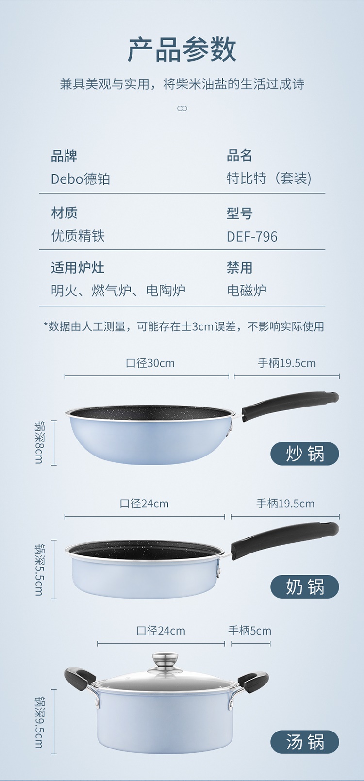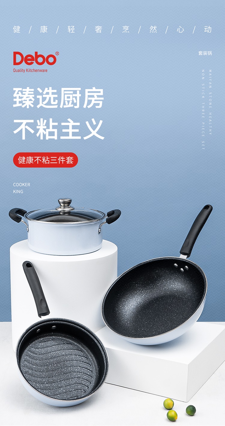 德国Debo德铂拉斯堡麦饭石色不粘少油烟套装炒锅+煎锅+汤锅三件套