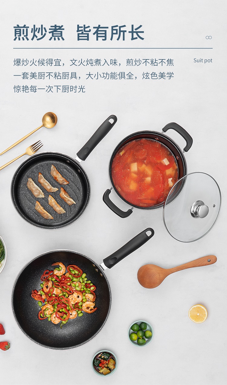 德铂乐克尔Lecker幸福佳炒锅套装 麦饭石锅 汤锅煎锅三件套不粘锅家用组合