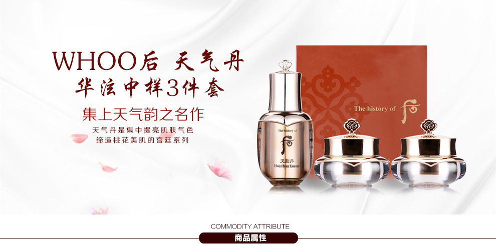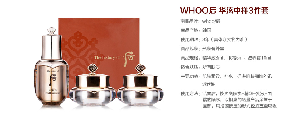 LG集团子公司LG生活健康旗下的化妆品品牌。品牌于2003韩国上市,The History Of Whoo后,意为皇后的秘诀。其将《东医宝鉴》、《本草纲目》等传世医典中记载的皇后养颜秘方,萃取稀缺名贵的韩方药材,结合现代护肤科技,一经推出,让广大的韩国女性为之疯狂与倾心。“WHOO后”坚持对高品位、高格调之美的追求,并以此作为品牌价值与理念。如今,WHOO后成为深受东方女性追捧的韩国奢华宫廷护肤名品。