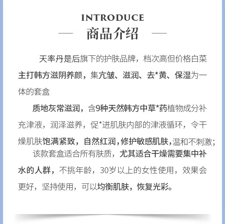 该款套盒尤其适合干燥需要集中补水的人群,不挑年龄,30岁以上的女性使用,效果会更好,坚持使用,可以均衡肌肤,恢复光彩。