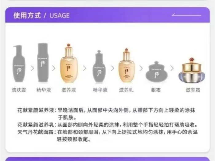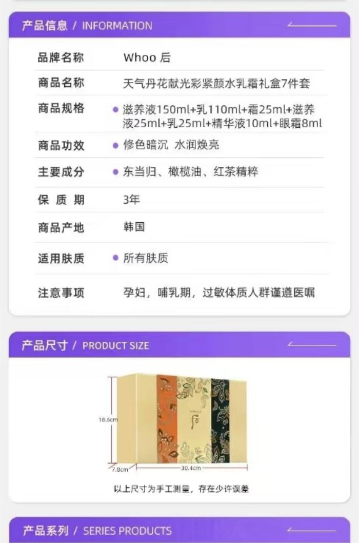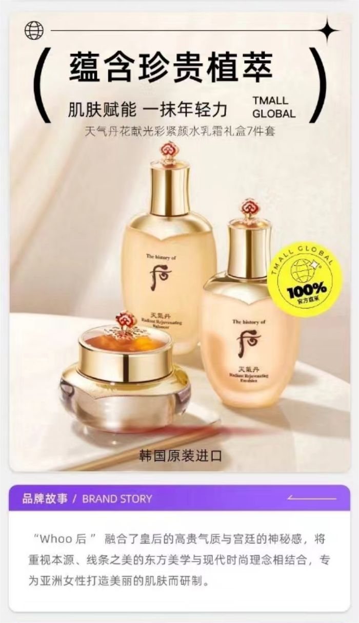 LG集团子公司LG生活健康旗下的化妆品品牌。品牌于2003韩国上市,The History Of Whoo后,意为皇后的秘诀。其将《东医宝鉴》、《本草纲目》等传世医典中记载的皇后养颜秘方,萃取稀缺名贵的韩方药材,结合现代护肤科技,一经推出,让广大的韩国女性为之疯狂与倾心。“WHOO后”坚持对高品位、高格调之美的追求,并以此作为品牌价值与理念。如今,WHOO后成为深受东方女性追捧的韩国奢华宫廷护肤名品。