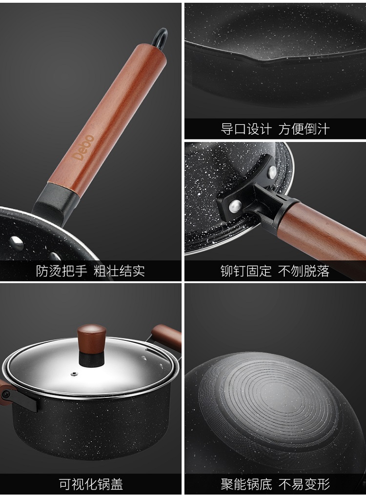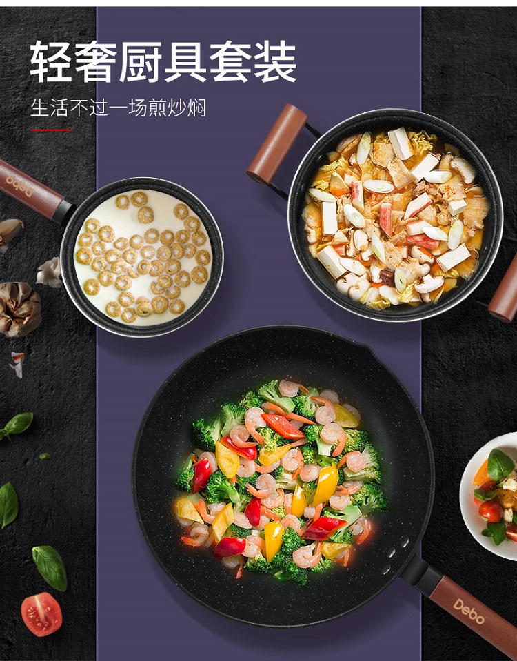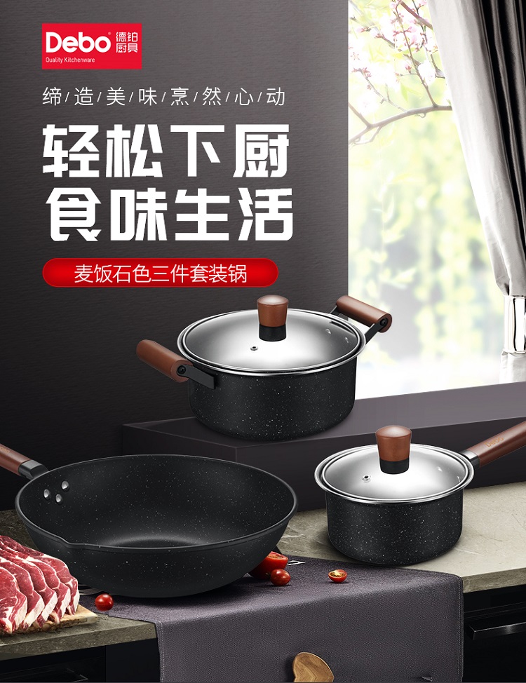 德国Debo德铂拉斯堡麦饭石色不粘少油烟套装炒锅+煎锅+汤锅三件套