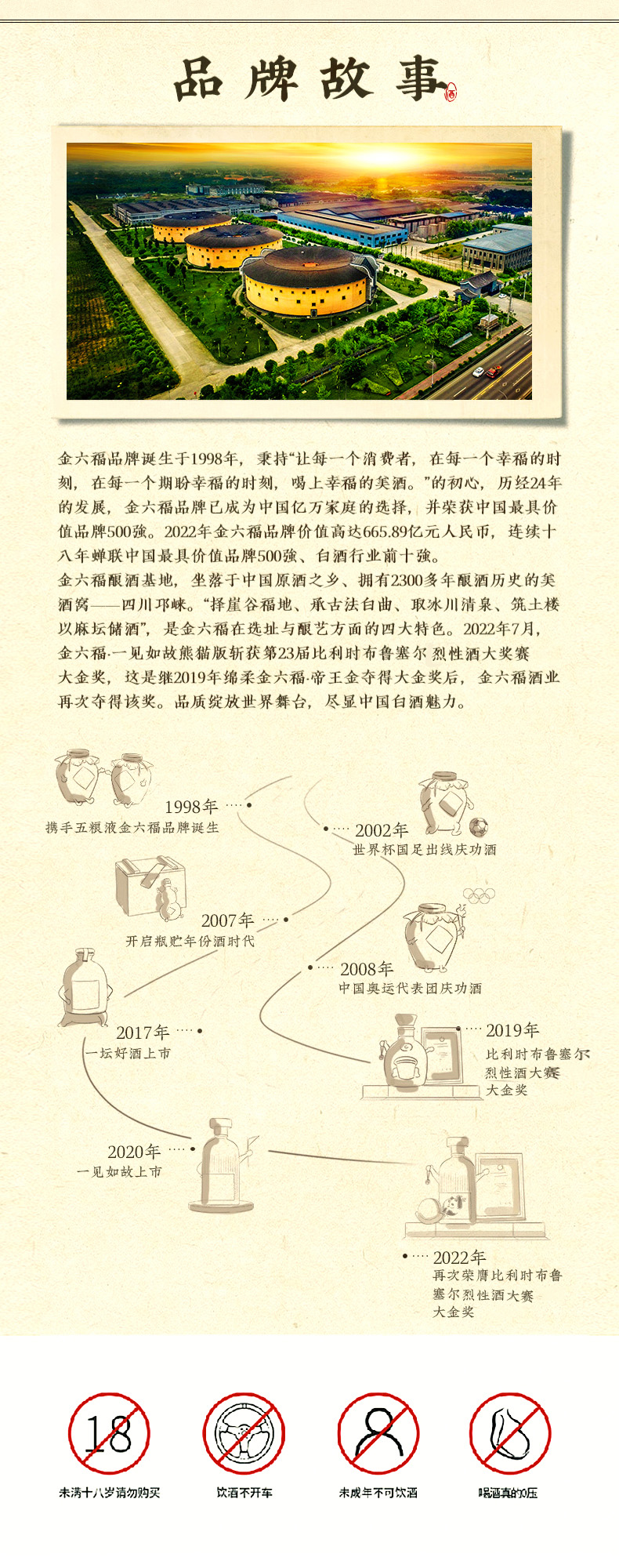金六福是老百姓办喜事、团圆饭、走亲访友首选的白酒品牌是国内为数不多的真正具备高知名度、高美誉度、高联想度的高价值品牌。2022年,经权威机构认证