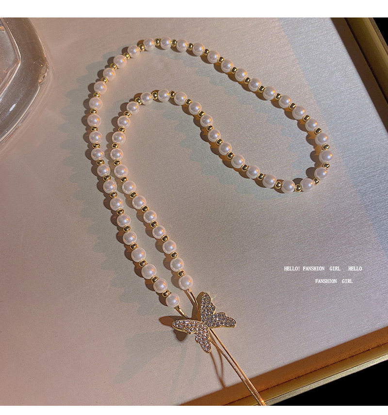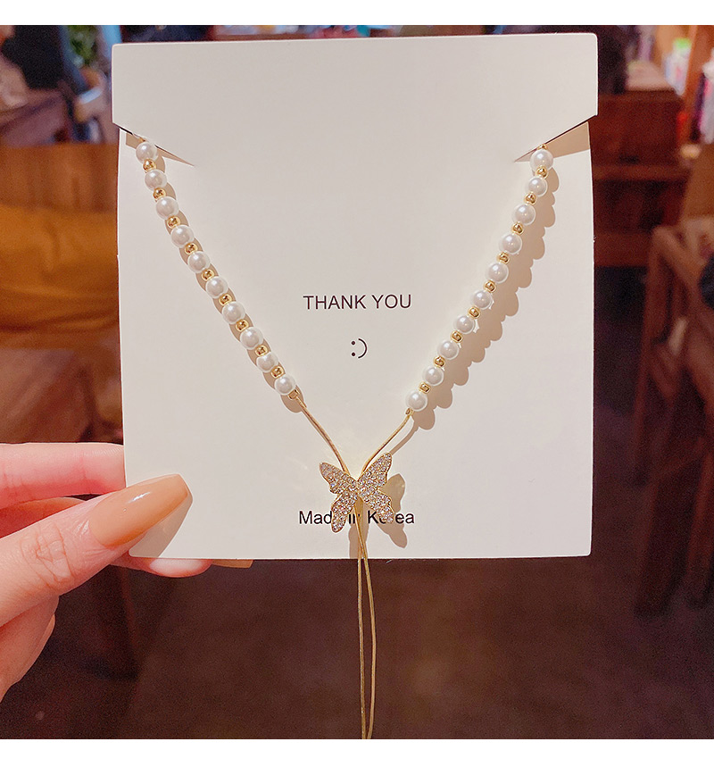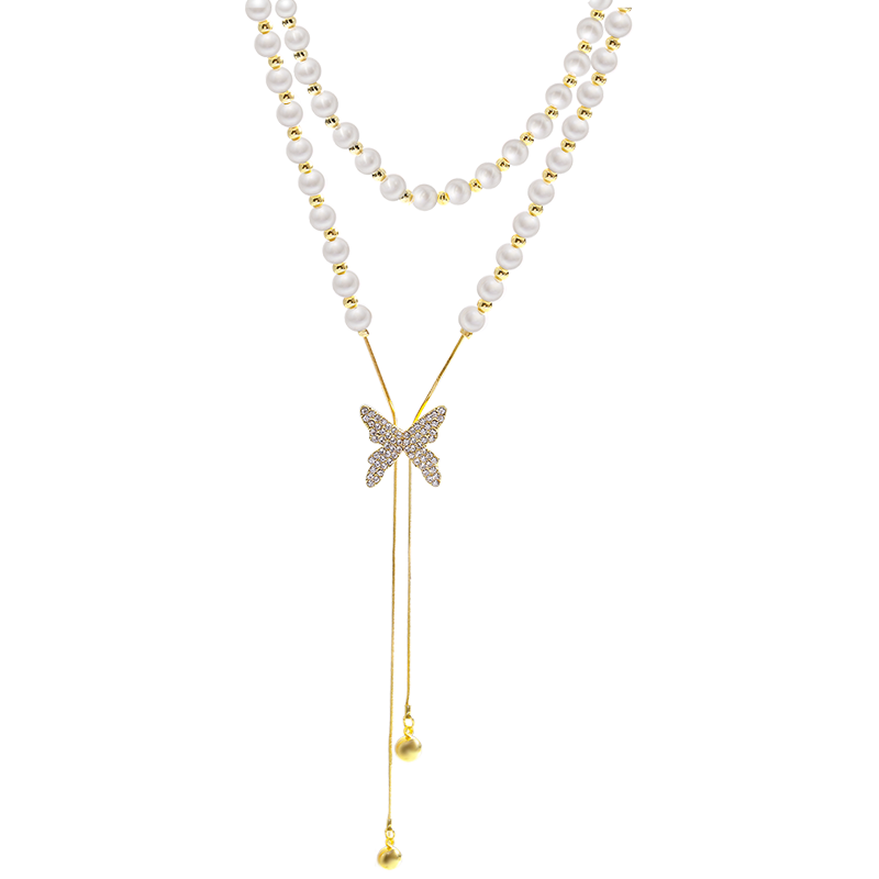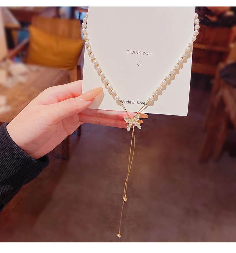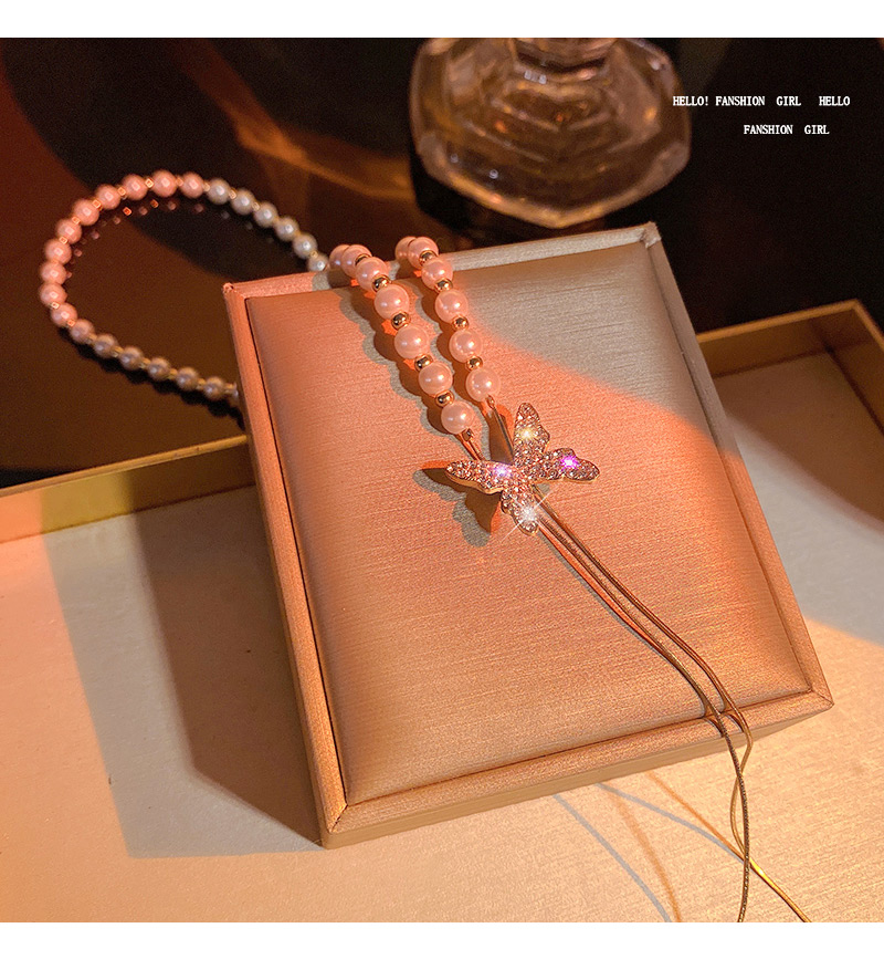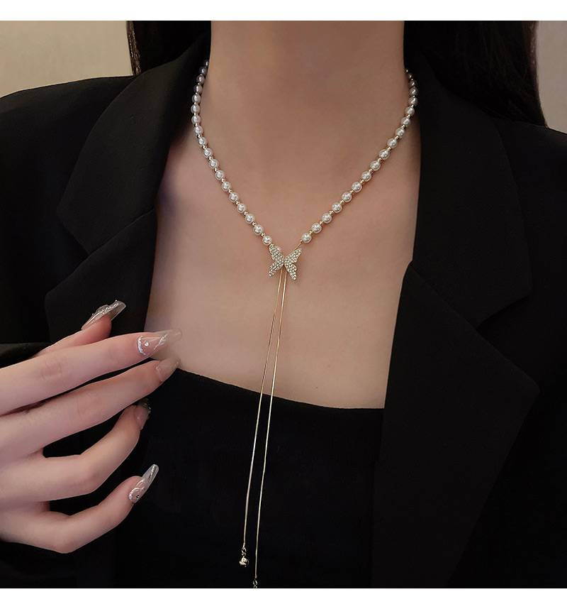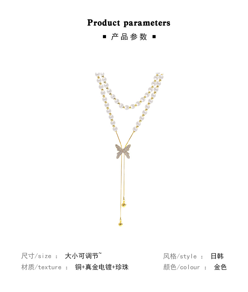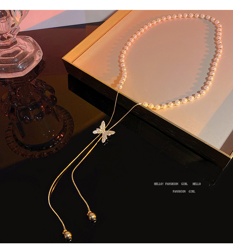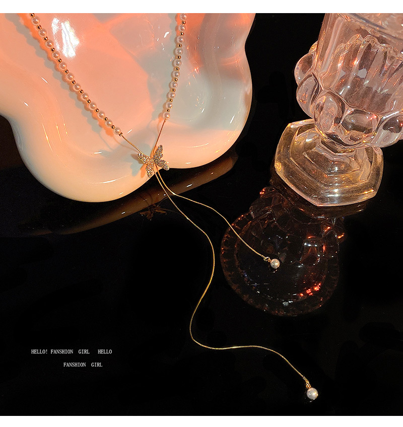 雅图小贝新款ins钛钢珍珠项链女轻奢小众网红同款满钻蝴蝶流苏锁骨链x880金色