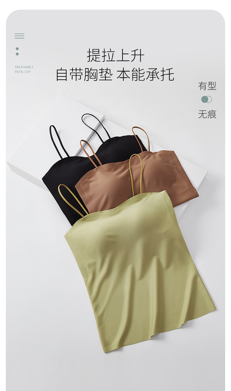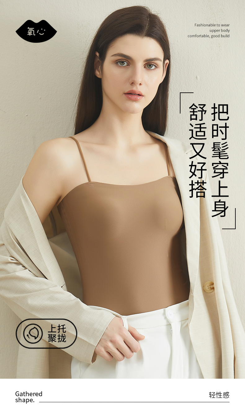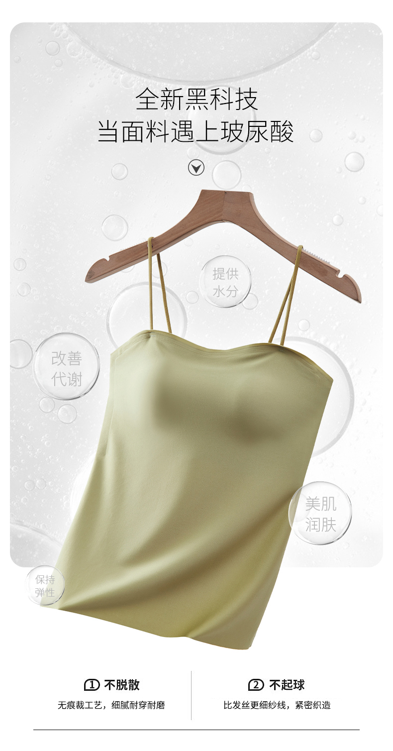 " 1.全新黑科技混合时髦——当面料遇上玻尿酸,在织物中添加添加“天然保湿因子”玻尿酸,能源源不断地给肌肤提供水分,改善营养代谢,保持良好弹性,促进肌肤健康,予肌肤温柔守护,手感亲肤细腻,弹性大,能够包容不同的身形,上身舒适无痕,亲肤不闷热; 2.长款版型,是肚子有肉宝宝的最佳选择,上身收腰显胸大,自然修饰身材比例,很好的勾勒出身形曲线,一字美背简洁干练,勾勒性感美背,轻巧百搭,时髦度、显瘦度、气质度、实穿度都是满分,既舒适又好搭的背心,让你上身就舍不得脱掉~ 3.自带胸垫二合一设计,贴心又方便,连杯设计,3D天然亲肌棉杯垫,上薄下厚,吸湿透气不闷热,舒适承托起胸部的同时也能做到大胸托得稳,小胸不空杯;可拆卸式设计,自由拆卸,方便清洗的同时又不易滋生细菌 4.橡筋肩带,弹力好,舒适不紧绷,一字领领型,能够有效勾勒出肩颈线条,突出精致锁骨,平衡头身比列,加重视觉纤瘦感,可以有效遮副乳,凸显直角肩,简约立体的剪裁贴合身形,舒适无负担,经典不会过时的版型,可以搭配任何外套开衫或者直接外穿,是每个女生衣橱里不能错过的单品,是一年四季都能穿的必囤款,每一季也都能搭配出新时尚新花样~ "