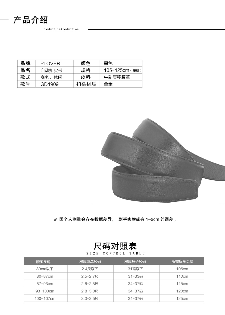 啄木鸟PLOVER男士自动扣皮带商务腰带裤带 GD04A01-DA-B1