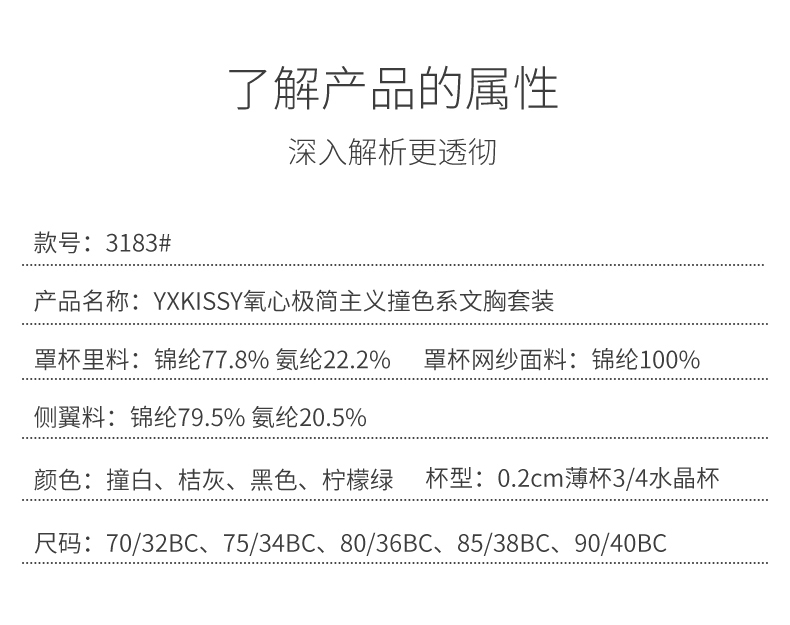 "93%A级乳胶棉:健康环保;防螨抗菌、抗过敏;Q弹Q软;吸湿透气;天然舒适。 1.超溥畅销0.2cm溥杯3/4水晶杯、超软弹钢圈,清爽魅惑、轻盈不勒; 2.胸前睫毛蕾丝花边加高抹胸设计,加上胸前镂空设计,时尚性感,又极具包容性,不管是大胸小胸都能收拢的非常好。 3.一种颜色代表一种性格,时尚大胆的撞色设计,让整个文胸更加性感。"