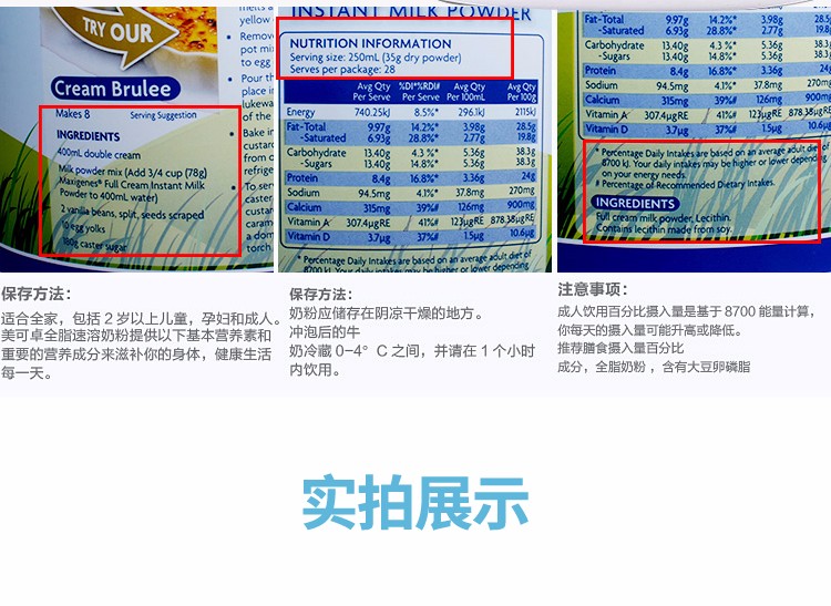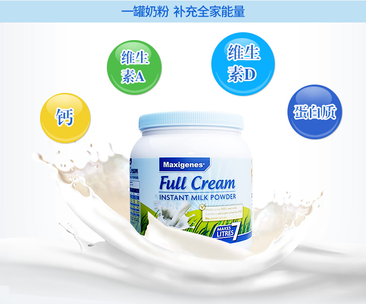 1000g一罐,包装期730天。一款全家都适用的奶粉,3岁以上宝宝、孕妈咪、成人、老年人都适用;一般冲调35克250毫升水,偏爱浓口味的可以多加;热水凉水皆可。澳洲本土人气奶粉,圆咕隆冬的大瓶子太可爱。