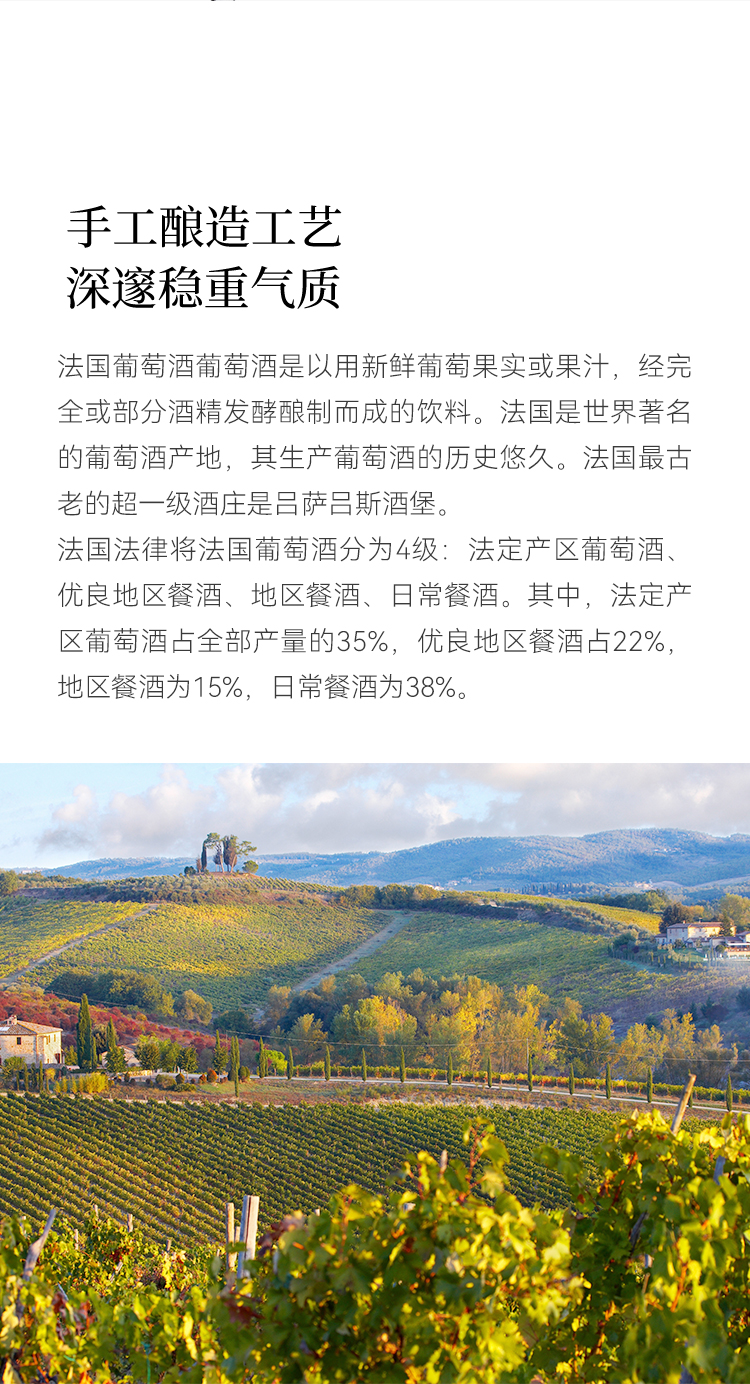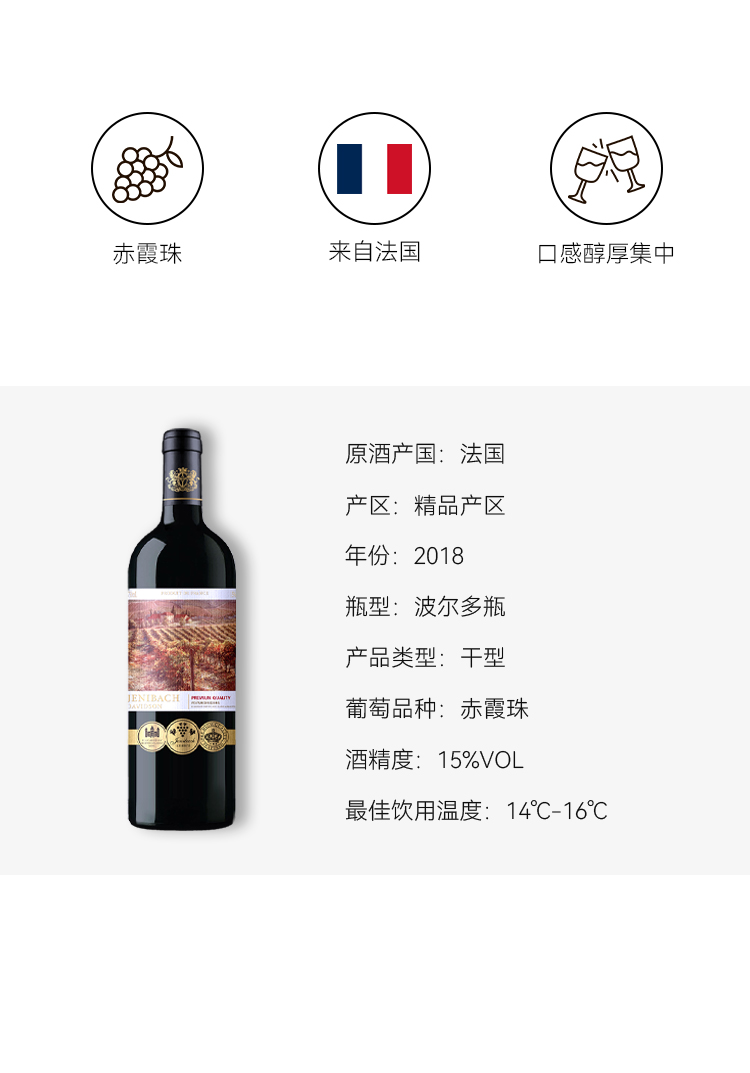 1.法国进口红酒 入门首选,精品酒产区,酒精度15度;2.手工酿造工艺,6个月橡木桶陈酿,纯手工采摘,葡萄采摘年份2018年; 3.单只扫码价1288元,庄主推荐款:高性价比,果香浓郁,酒体柔顺,适合大众口感。