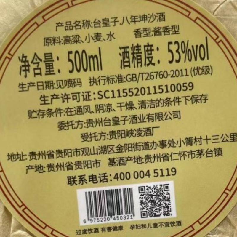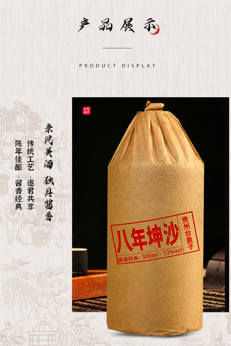 贵州台皇子酒业有限公司成立于2021年,是一家坐落于茅台镇酱香酒核心产区的酱香型白酒生产企业。 公司拥有2个酿酒基地,总占地50余亩,厂区建筑面积40000余平方米,窖坑240口,基酒储能达10000余吨,年产优质酱香白酒2000多吨。 台皇子酒业秉承“传承经典,创新发展”的理念,坚持以高粱、小麦、水为原料,采用传统酱香型白酒酿造工艺,精心酿造出品质优良的酱香白酒。