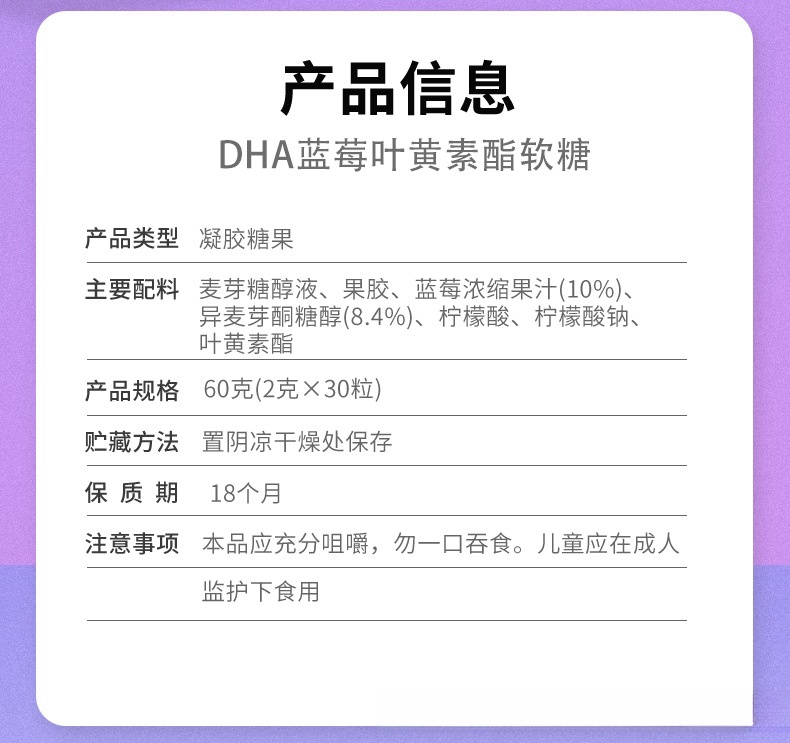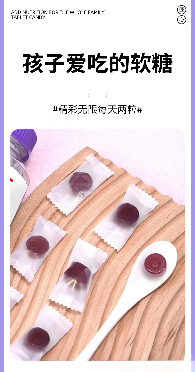 ①营养加倍,配料充足,明亮眼睛; ②为勤奋学习的孩子,为努力拼搏的自己,为就是不想睡的他和她; ③从工厂生产线到您舌尖,满满一瓶营养的美味软糖;