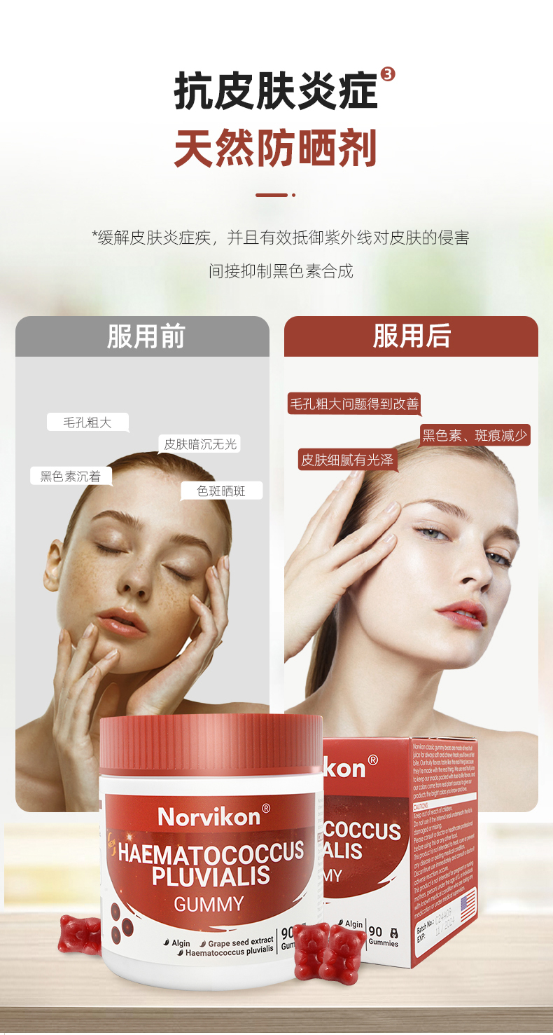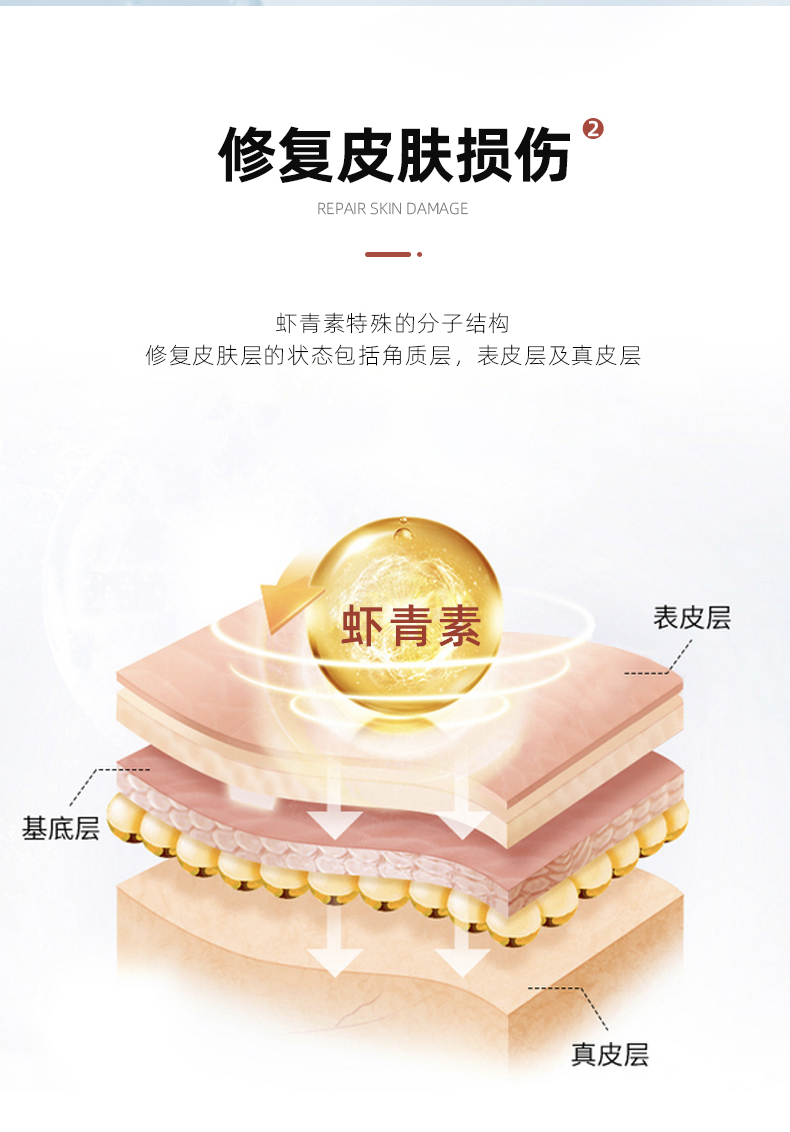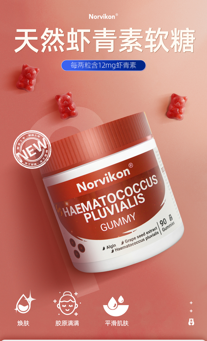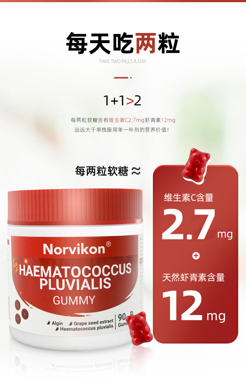 1、清除自由基,白皙肌肤,淡化纹路 2、1粒=6mg虾青素,每天2粒,满足肌肤每日所需的虾青素含量,无惧初老! 3、丰富的葡萄籽提取物、天然维生素C、桑葚汁,帮助调整色素堆积