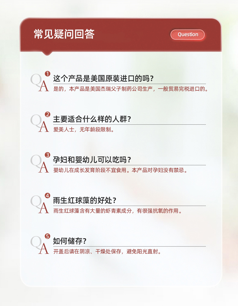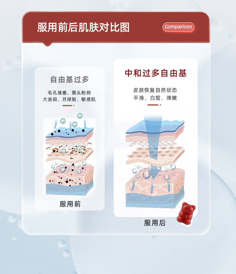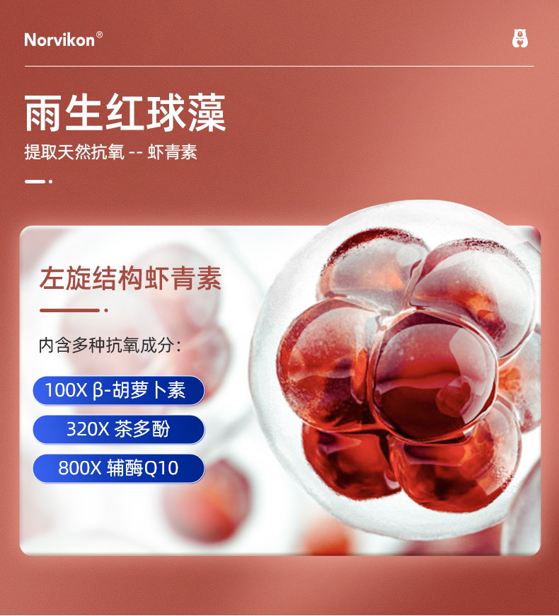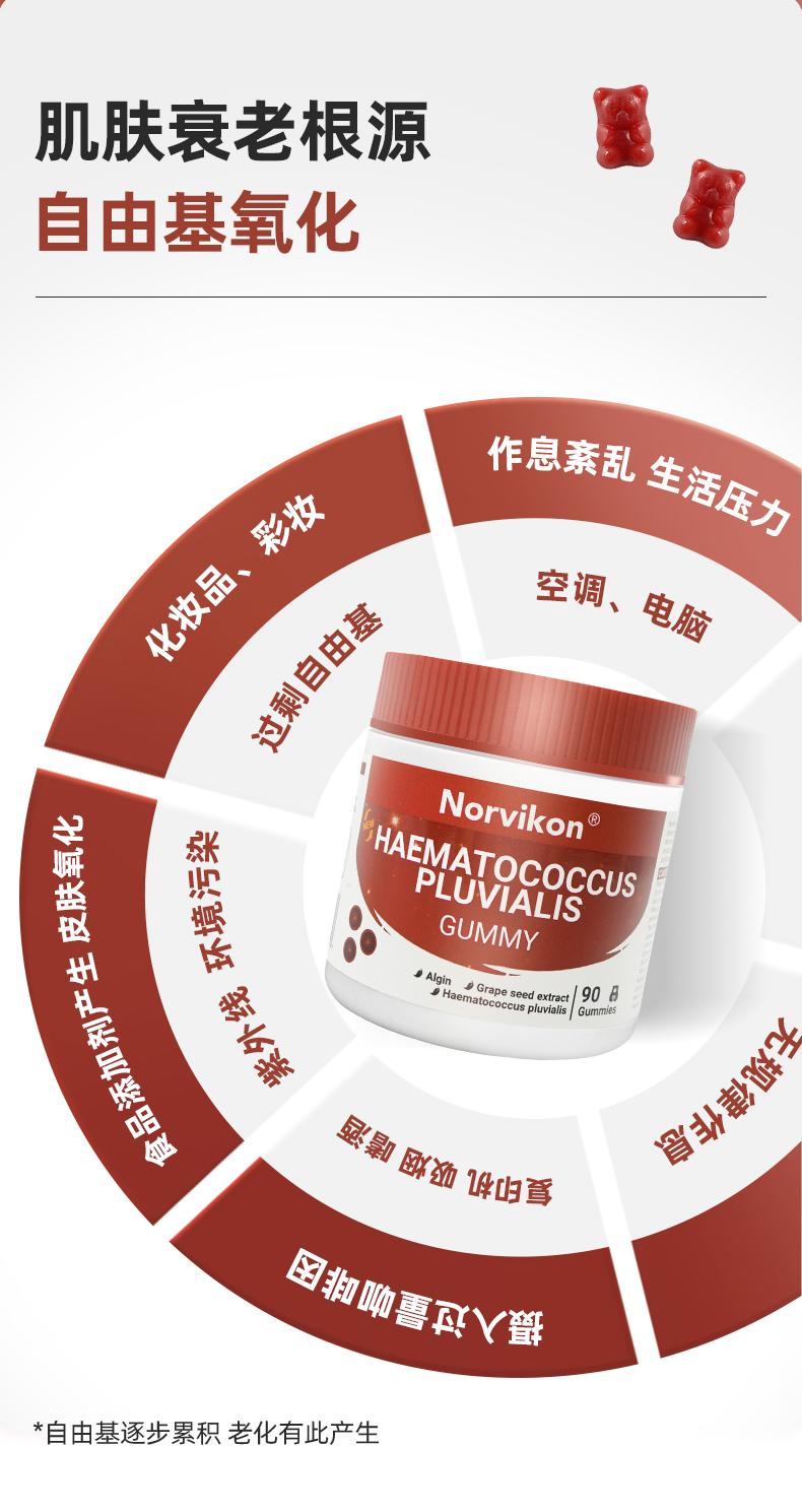 1、清除自由基,白皙肌肤,淡化纹路 2、1粒=6mg虾青素,每天2粒,满足肌肤每日所需的虾青素含量,无惧初老! 3、丰富的葡萄籽提取物、天然维生素C、桑葚汁,帮助调整色素堆积