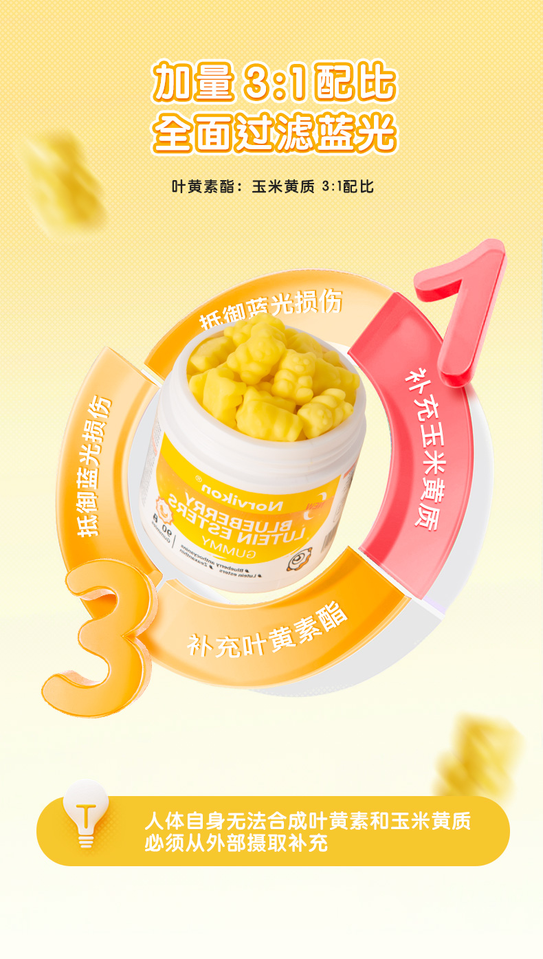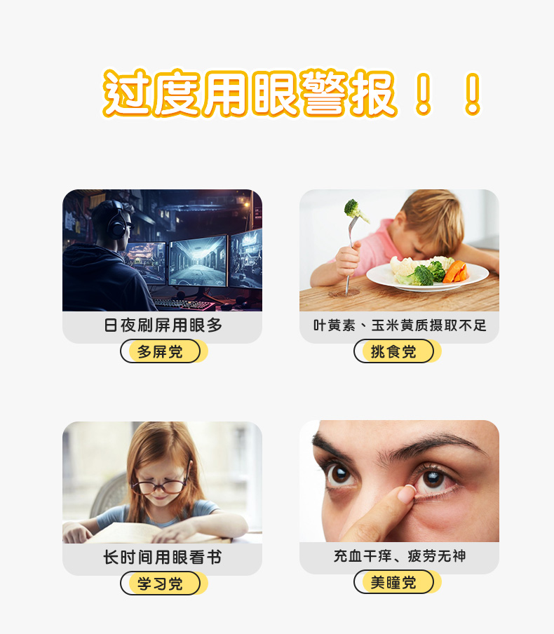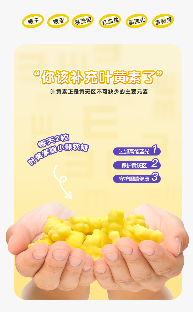 1、多效合一,全面护眼配方 2、每粒含6mg叶黄素脂,高含量,更护眼 3、0蔗糖、0色素、0香精、0防腐剂