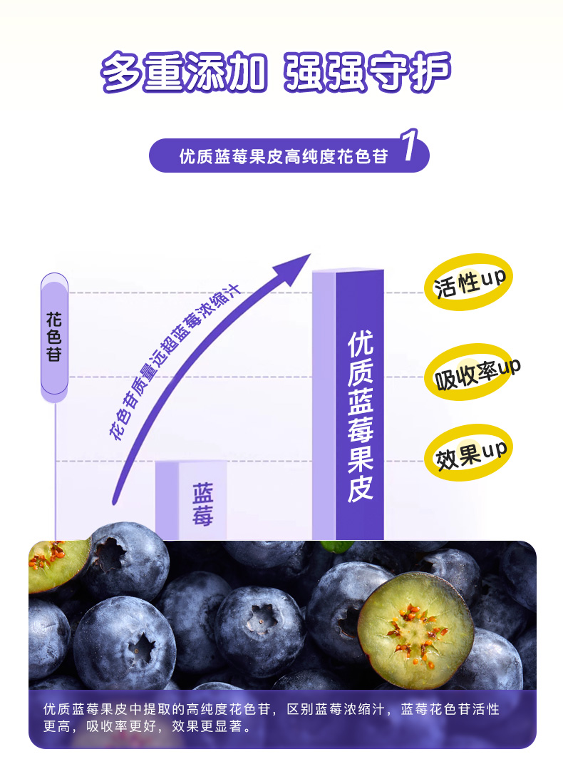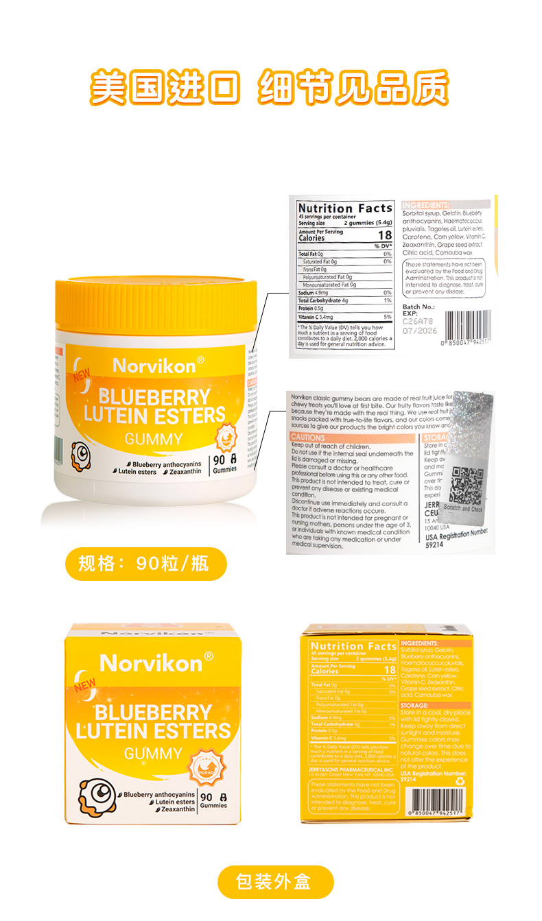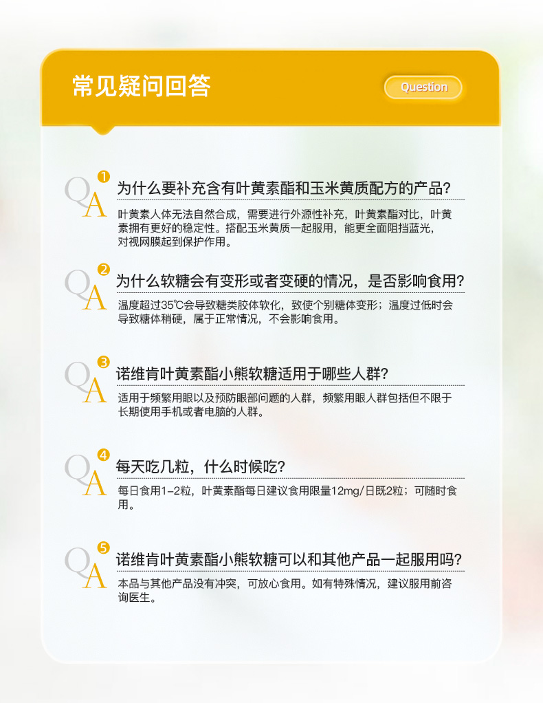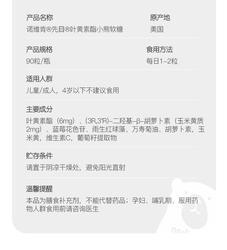 1、多效合一,全面护眼配方 2、每粒含6mg叶黄素脂,高含量,更护眼 3、0蔗糖、0色素、0香精、0防腐剂