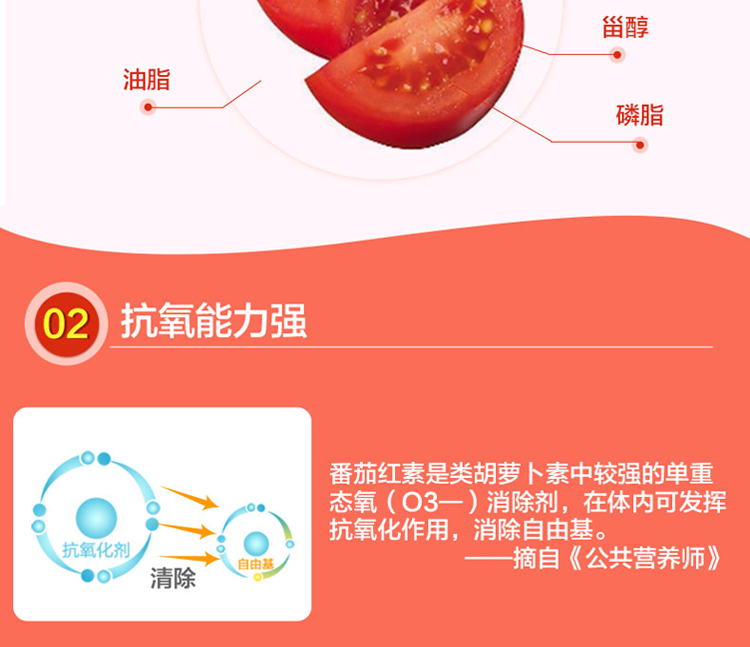 番茄红素是膳食中的一种天然类胡萝卜素,广泛存在于自然界的植物中,在成熟红色植物果实中含量较高,是类胡萝卜素中较有的抗氧化成分。人体内各组织器官均含有一定数量的番茄红素,但身体自身不能合成番茄红素。