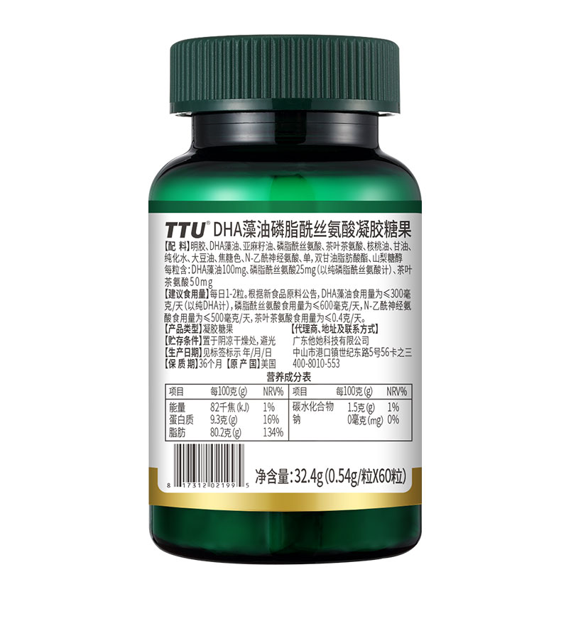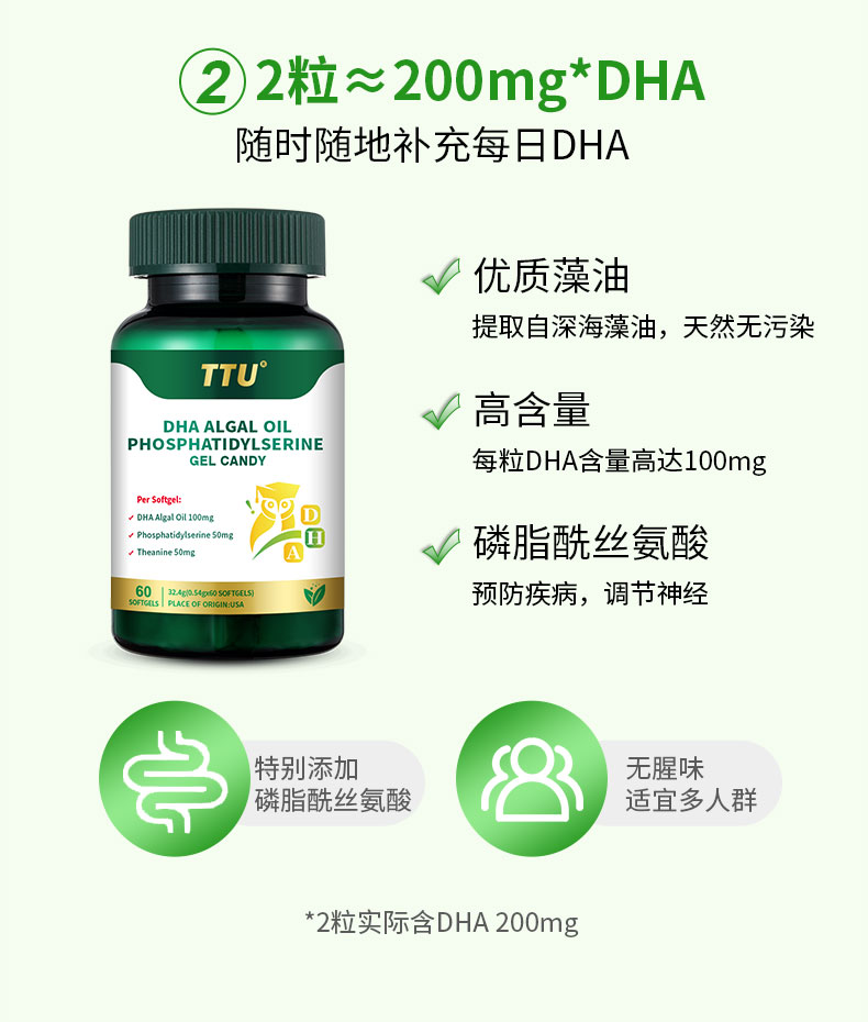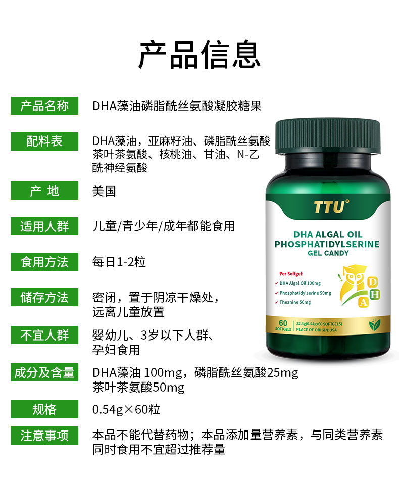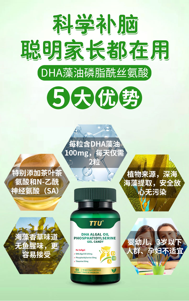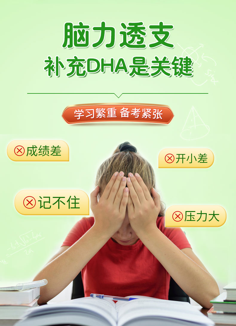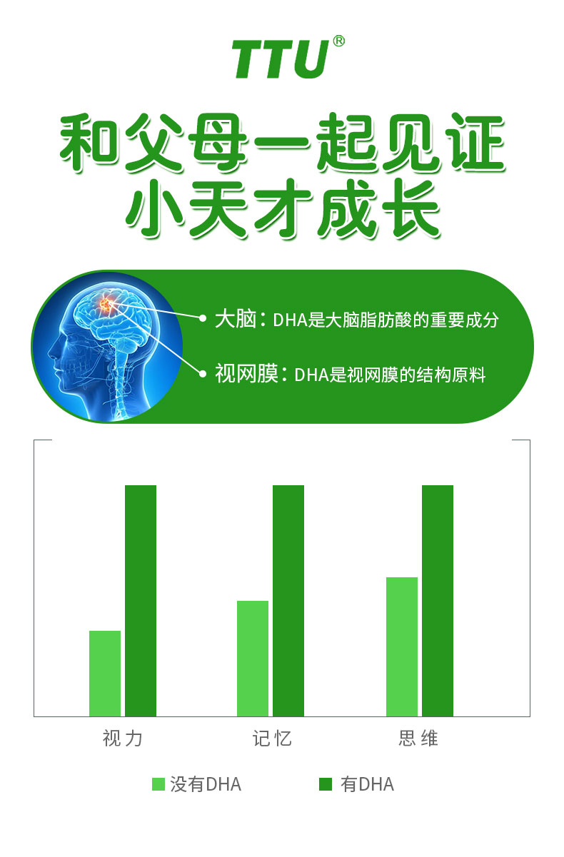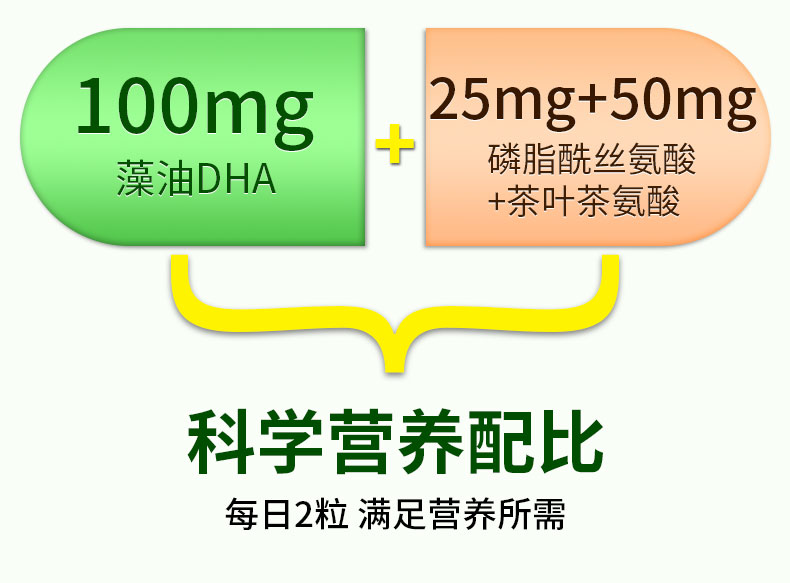 核心成分眼脑营养成分:DHA+PS,相互促进吸收,协同作用,为眼脑提供高效营养元