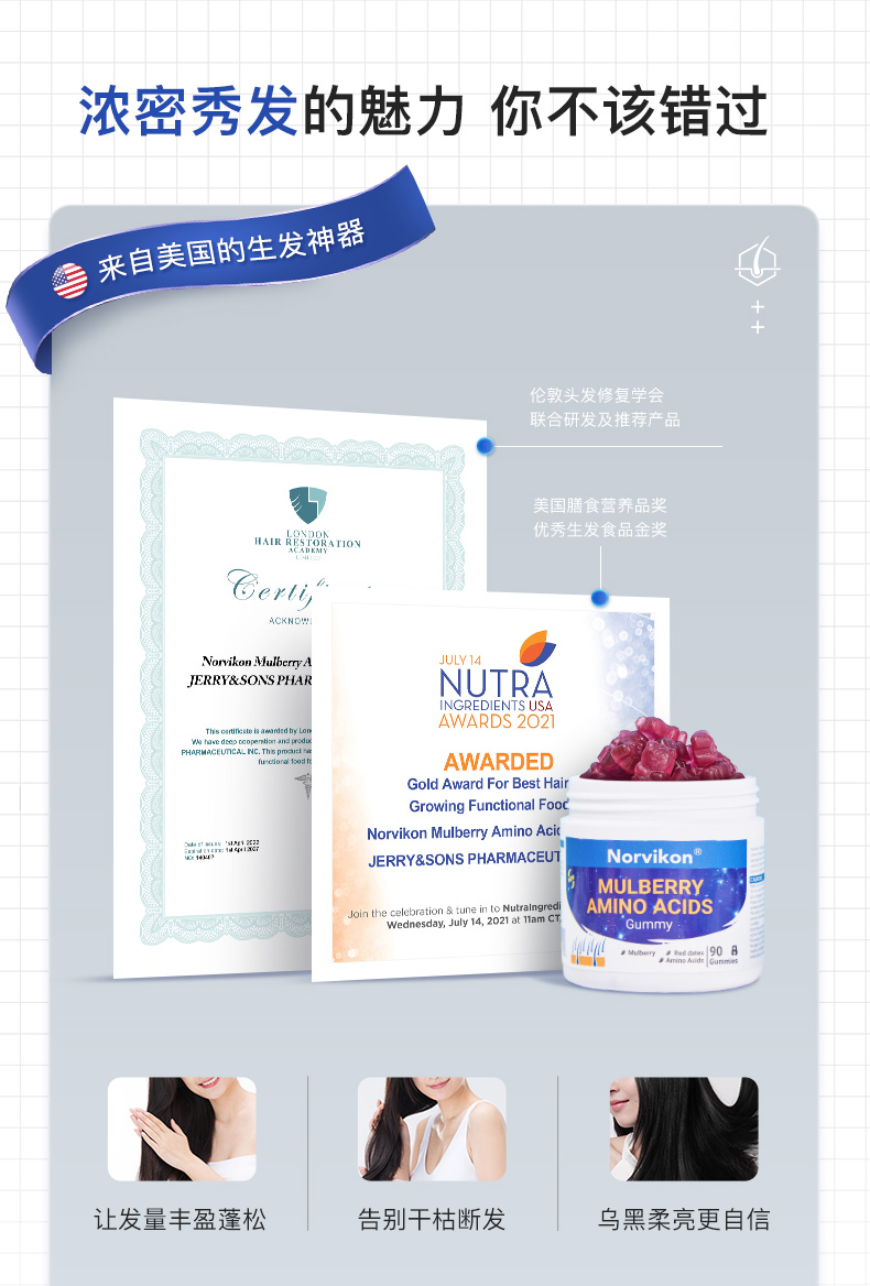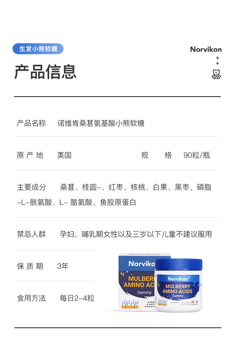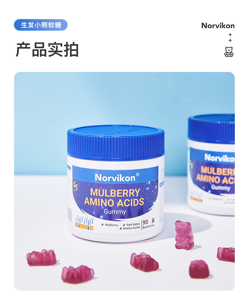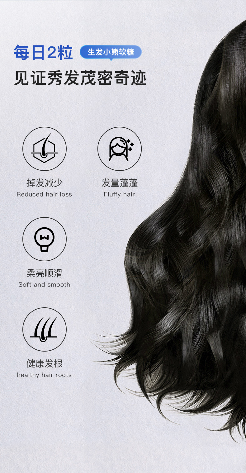1.美国原装进口的生发软糖,每天两粒,修复毛囊+防脱生发+坚韧发根! 2.添加多种有效成分,黑发生发,从根源上解决掉发问题! 3.超可爱小熊形状设计,QQ弹弹,吃起来就像吃零食一样,轻松养发 4.熬夜党、掉发族必备好物!0脂肪0色素,对身体没有负担!