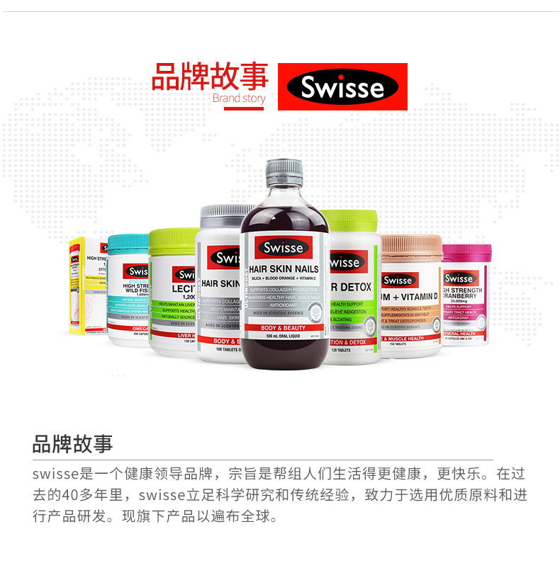 Swisse是一个全球性的专业营养品牌,由Kevin Ring于1969年在澳大利亚墨尔本创立。该品牌致力于研发结合现代科学认证和传统有效经验的产品,旨在让全世界人们生活得更健康、更快乐。Swisse的产品线非常丰富,包括美容养颜、益生菌类、运动健康、骨骼健康等多个产品大类,以满足不同年龄和性别人群的需求。品牌的产品原料多来源于各种植物,添加剂较少,因此相对安全,适合包括孕妇、老人和小孩在内的各类人群使用。
