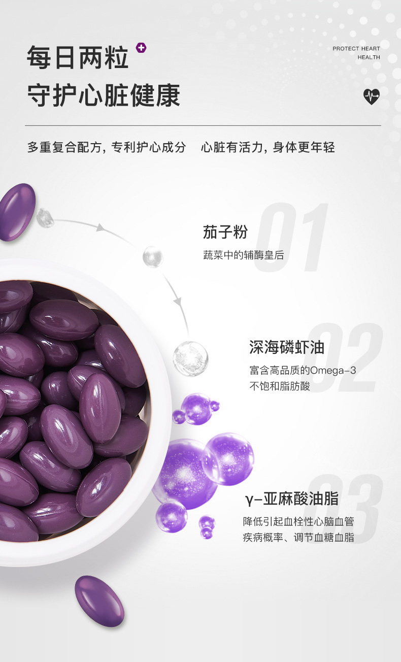 1.添加多重复合配方+专利护心成分,养护心脏,促进身体健康 2.美国原装进口,天然安全,无副作用,购买很放心 3.坚持每天食用2粒,告别胸闷气急,身心更加舒畅 4.每瓶90粒,性价比极高,食用时直接温水吞服