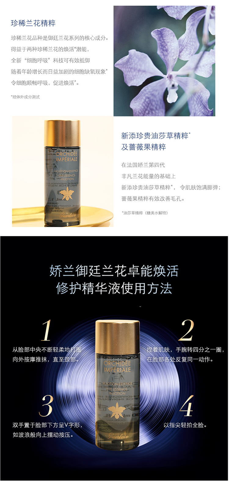 1828年,巴黎一个大胆创新和美丽传承的故事自1828年创牌迄今,法国娇兰不懈致力,在香水、护肤、彩妆领域不断探索、创新和臻善。既是大胆开启梦想之门的行业先驱亦是法国文化遗产宝藏中的一颗璀璨明珠。法国娇兰以自然与艺术为灵感之源,崇尚为人们带来欢乐和感官愉悦的美丽哲学美丽哲学大胆的作品创新是对致以美妙事物与真挚情感的承诺历经近两百年的时光洗礼,法国娇兰对所有与美相关的事物皆情有独钟,为笔触下新鲜流淌的奇思妙想而激动为大胆创新的每一步进阶而欣喜。