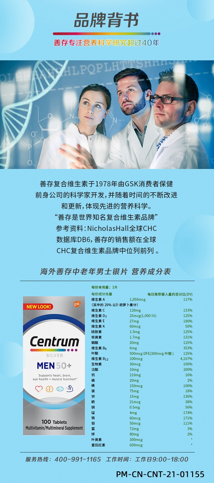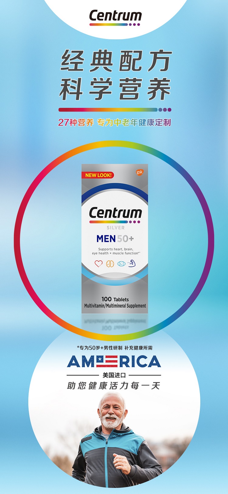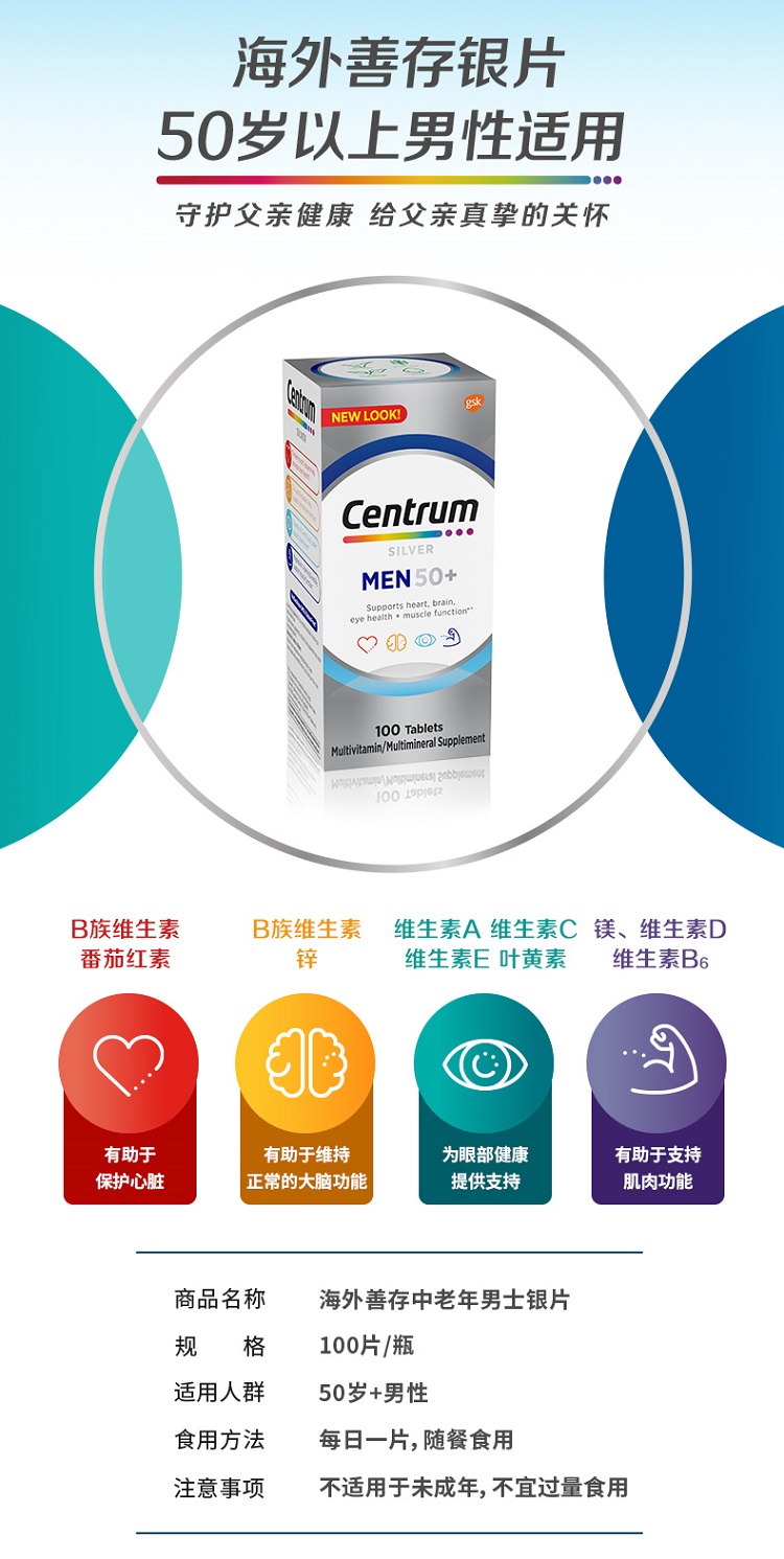 专为50岁+男士健康定制,各类维生素有助于促进心脏健康、为大脑功能提供支持、眼部明眸亮眼更清晰、更有助于保持强壮骨骼,守护父亲健康,特加番茄红素、每天1粒,老当益壮很轻松,善存Centrum40余年医学营养研究,专业科学经典配方【100片便携装】