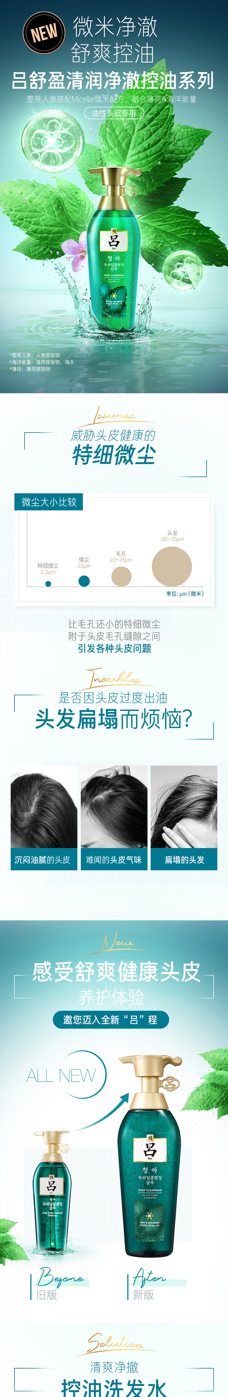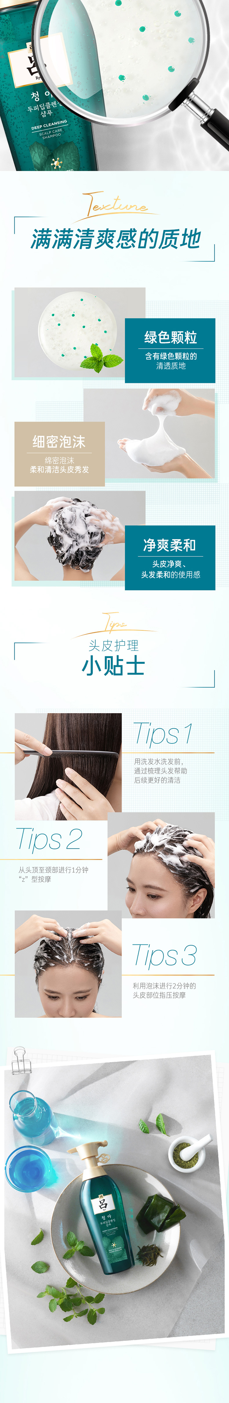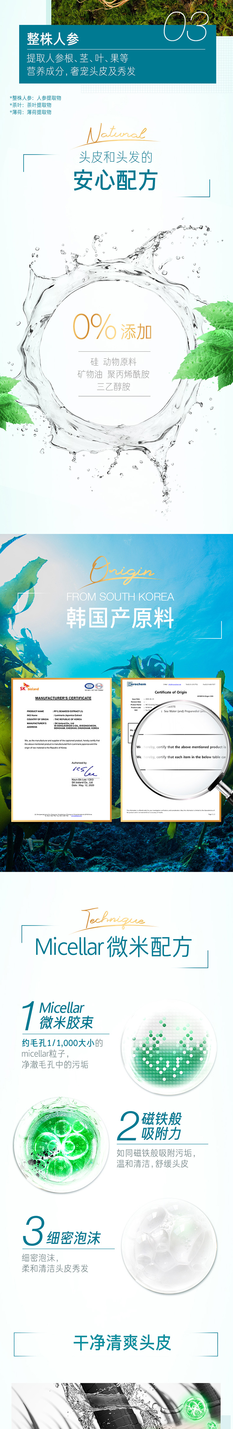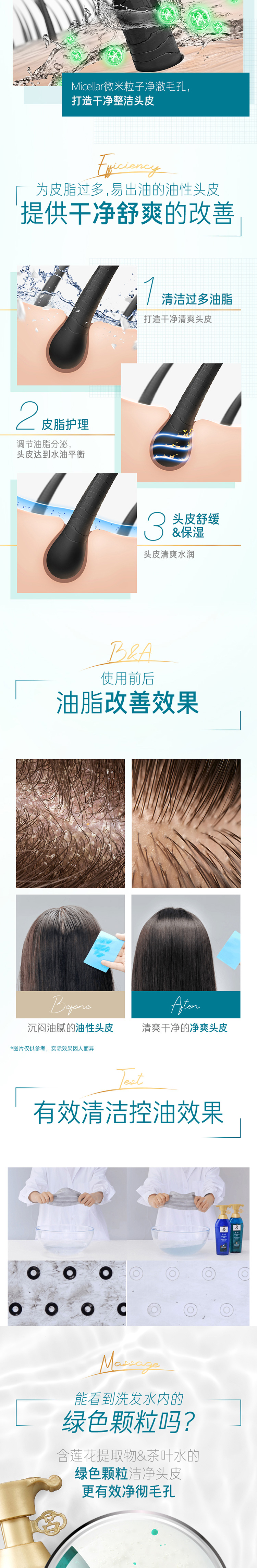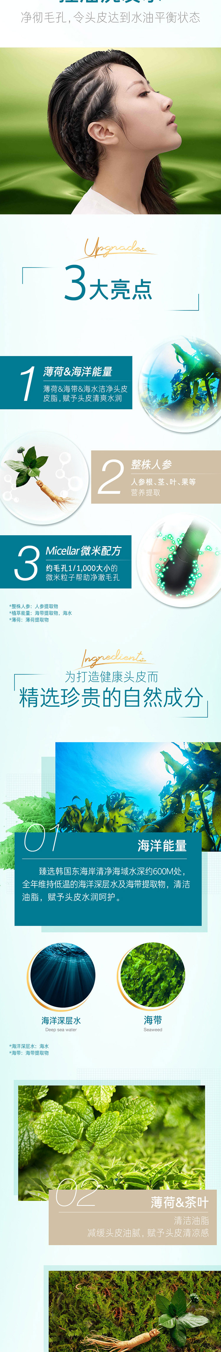 海藻,松叶,发酵薄荷多种植物萃取成分,头皮净爽效果升级 由绿茶水,莲花成分混合制成的绿色微粒,可达到温和按摩的功效,温和清洁角质,净化头皮环境 无硅成分,洗后秀发轻盈蓬松 注意:新版均为国产版本
