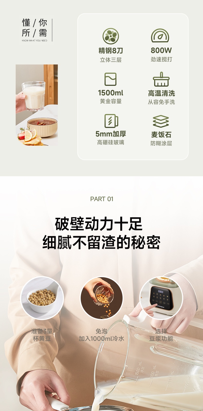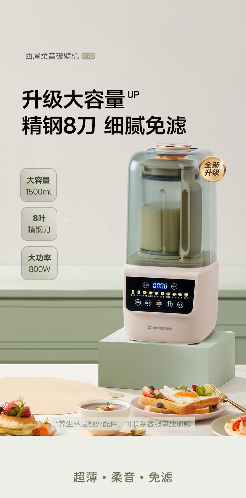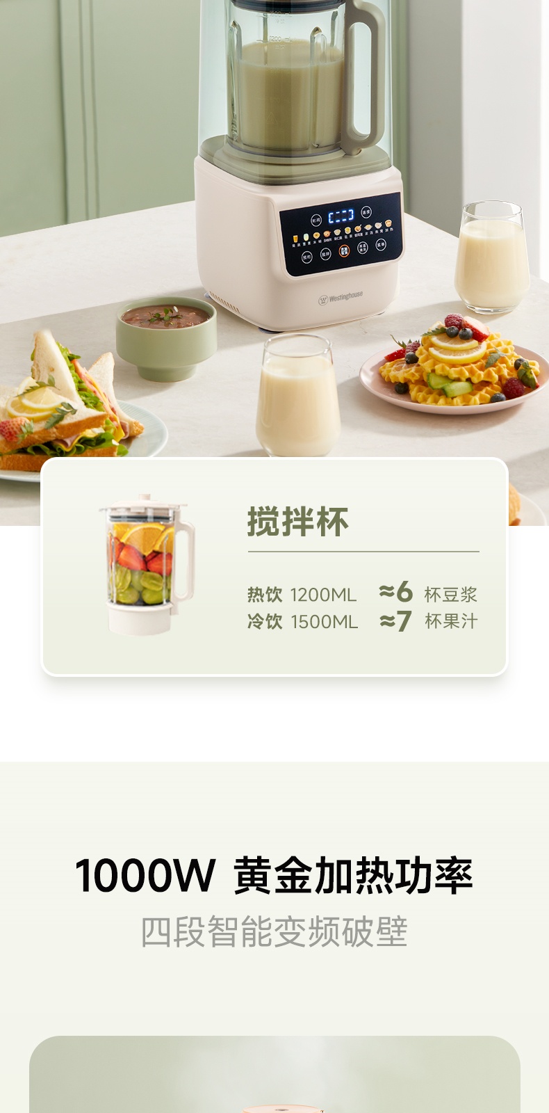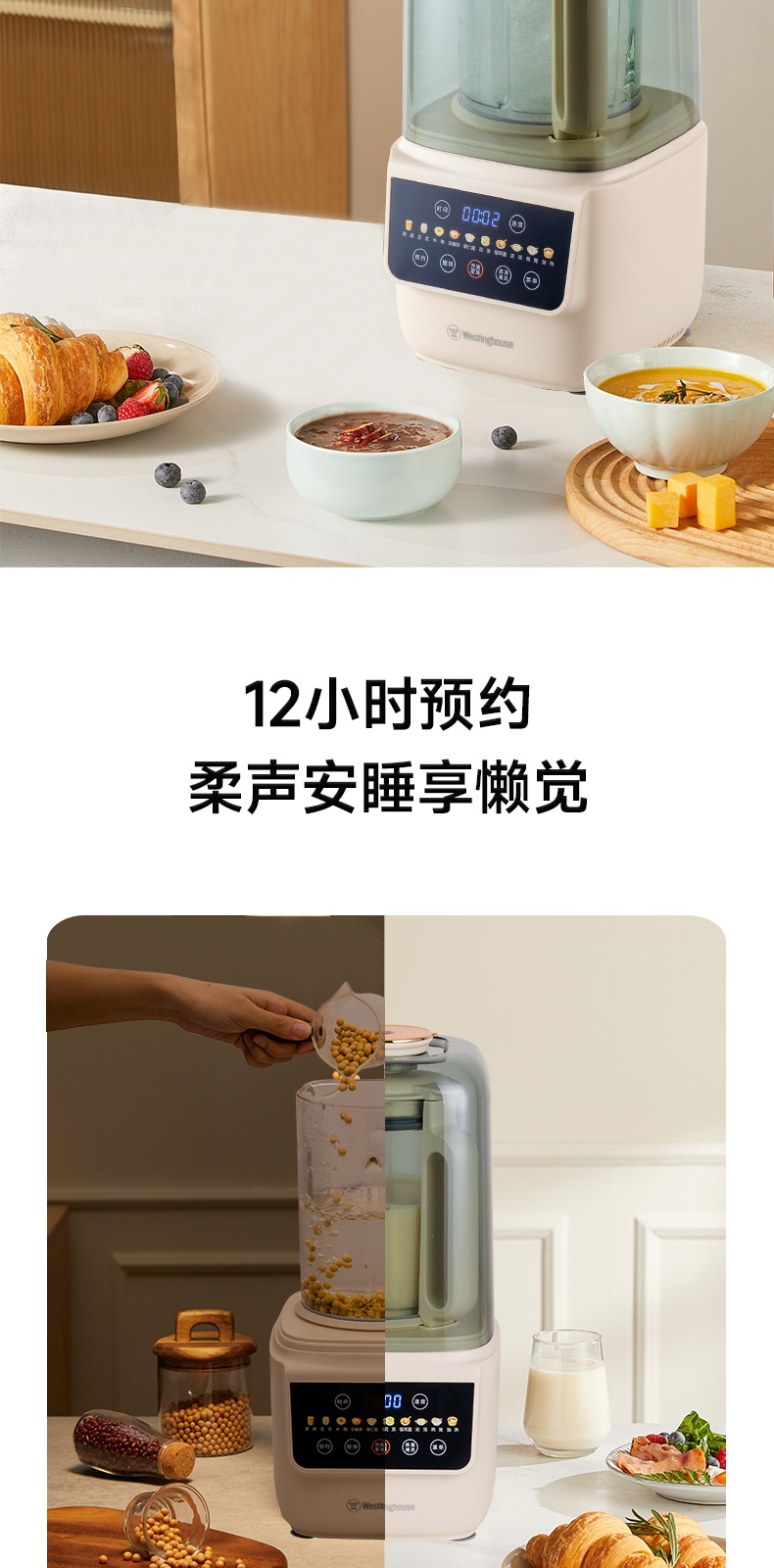 "*轻便 柔音 养生 *密闭隔音舱 最低53分贝 *触控彩屏 *细腻免滤 *十大菜单 *一键清洗 *可视化烹饪 *防烫大提手 *开盖自动停机保护 *多功能-十大菜单功能 *1~12小时预约 *食品级麦饭石陶瓷底盘,杜绝糊底易清洗 *底部4个防滑胶脚"" 十大菜单:果蔬、豆浆、米糊、杂粮粥、果仁露、花茶、 银耳羹、浓汤、燕窝、加热 包装配件:整机 说明书 电源线 清洁刷 量杯 预约时间可调:1~12h预约 搅拌档位可调:1~8档"