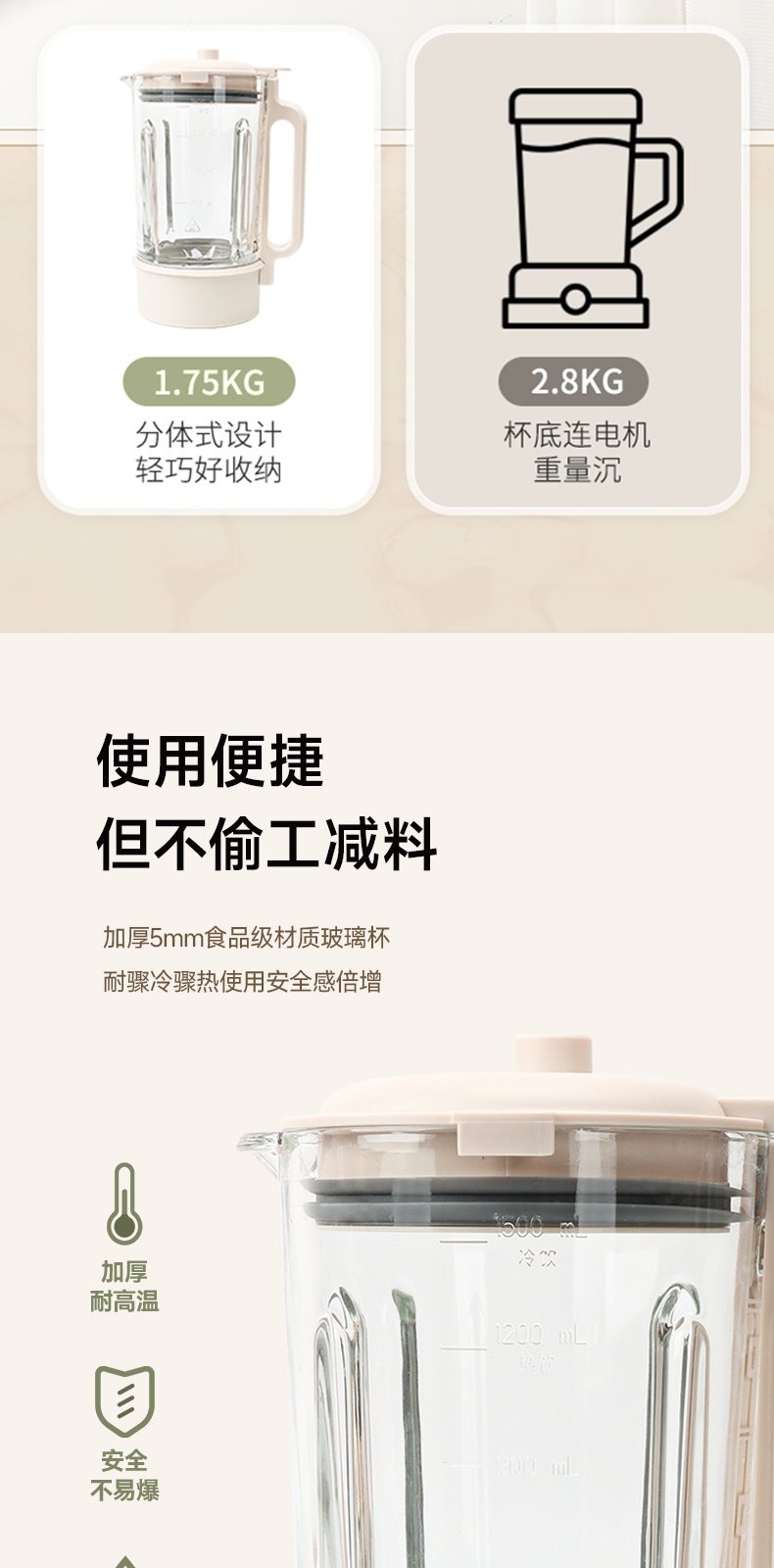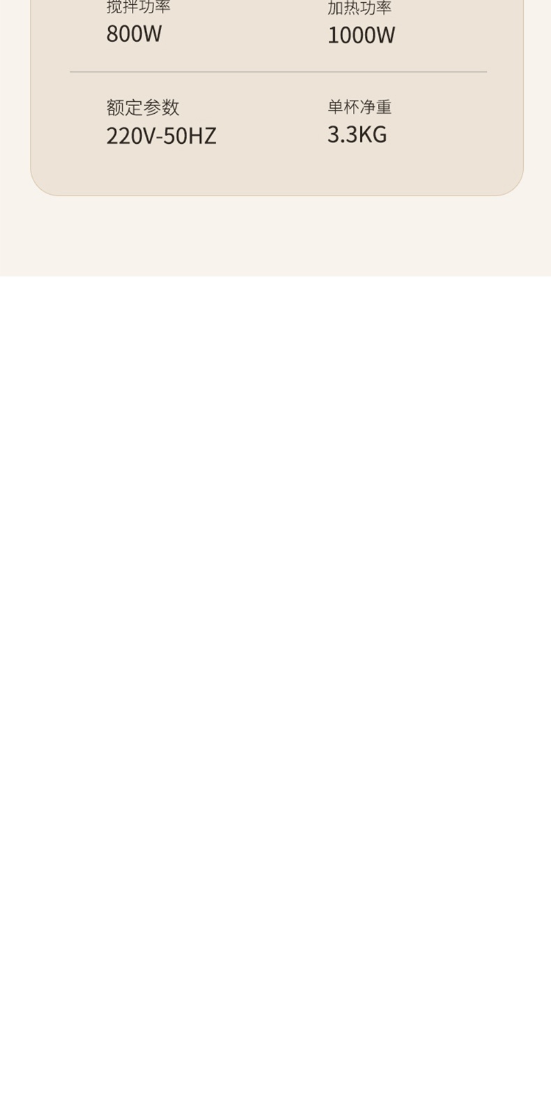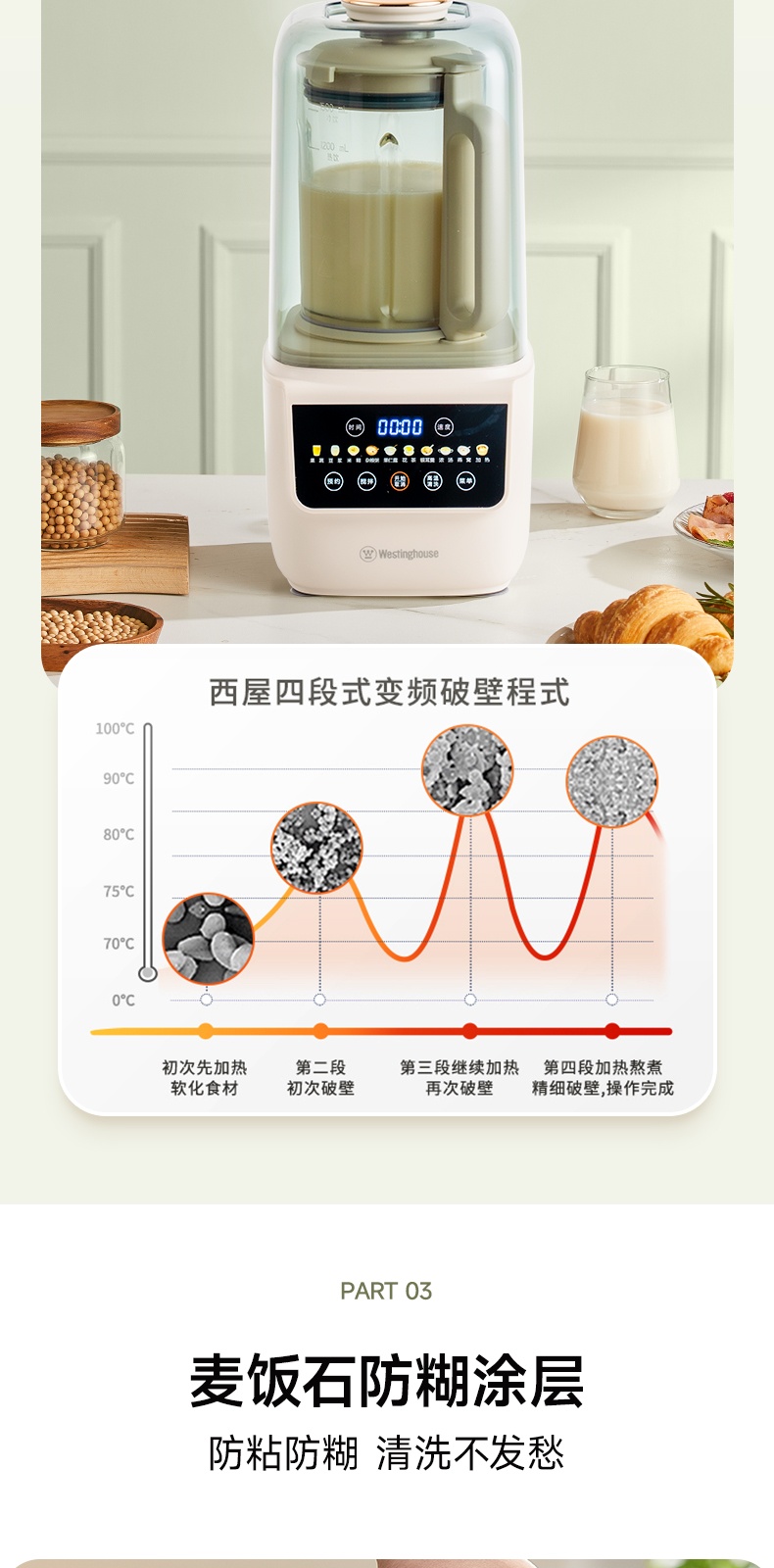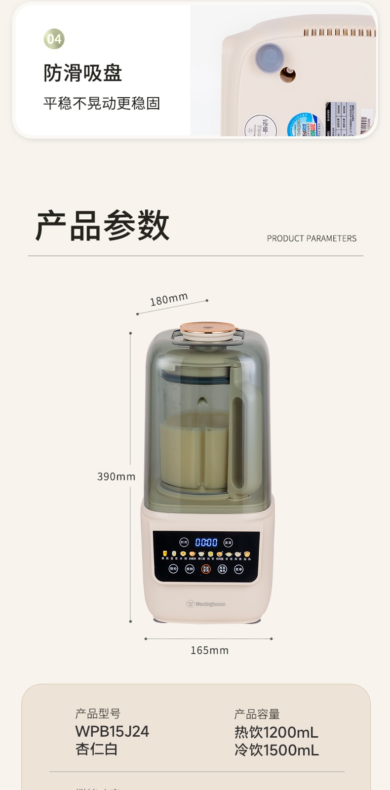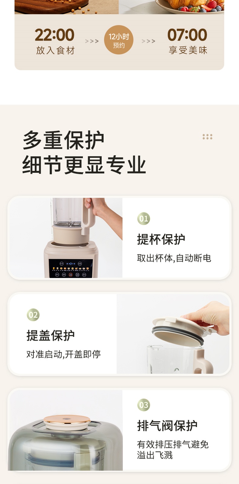 "*轻便 柔音 养生 *密闭隔音舱 最低53分贝 *触控彩屏 *细腻免滤 *十大菜单 *一键清洗 *可视化烹饪 *防烫大提手 *开盖自动停机保护 *多功能-十大菜单功能 *1~12小时预约 *食品级麦饭石陶瓷底盘,杜绝糊底易清洗 *底部4个防滑胶脚"" 十大菜单:果蔬、豆浆、米糊、杂粮粥、果仁露、花茶、 银耳羹、浓汤、燕窝、加热 包装配件:整机 说明书 电源线 清洁刷 量杯 预约时间可调:1~12h预约 搅拌档位可调:1~8档"