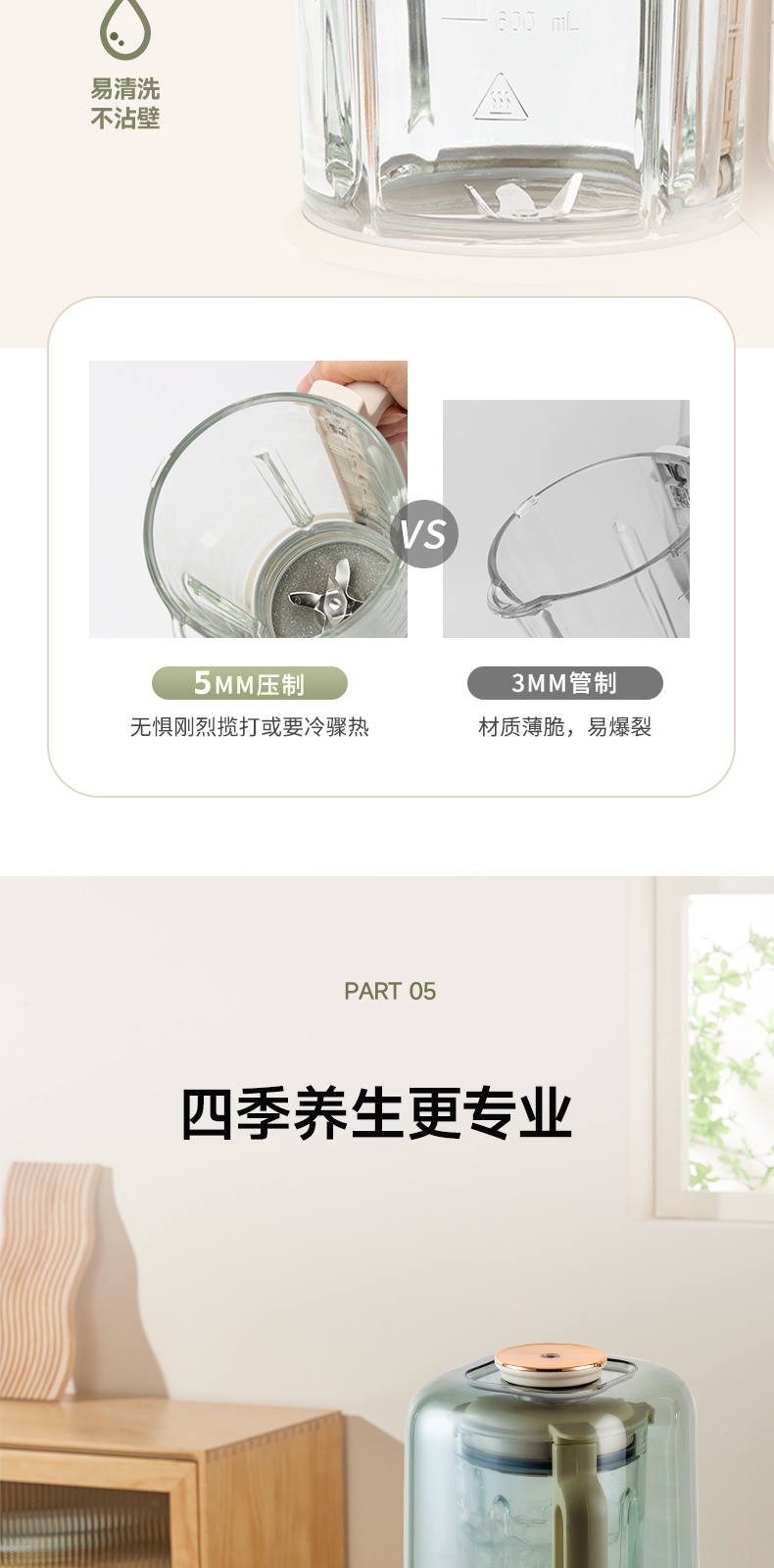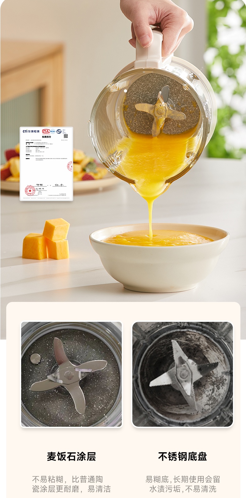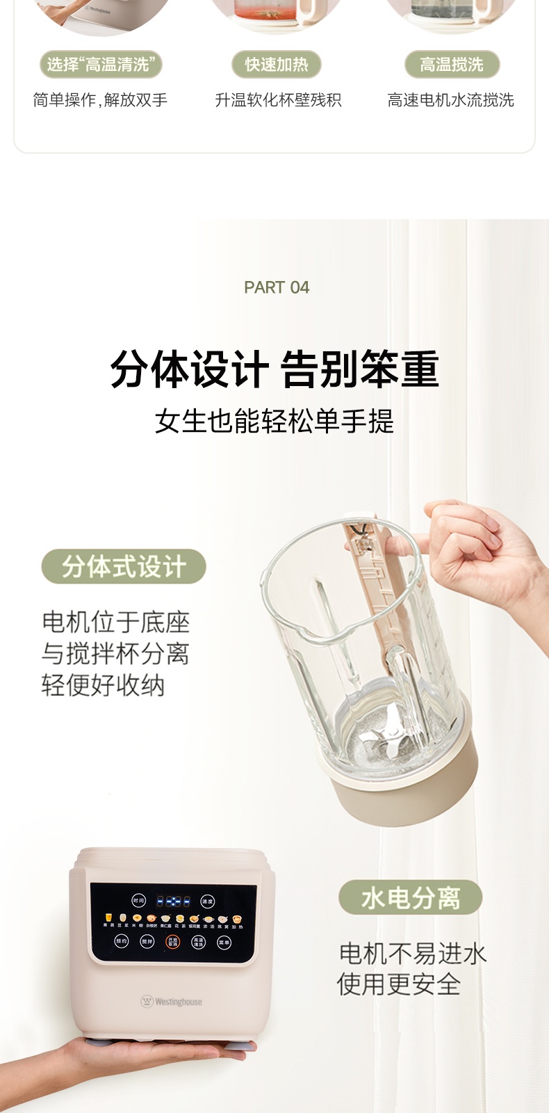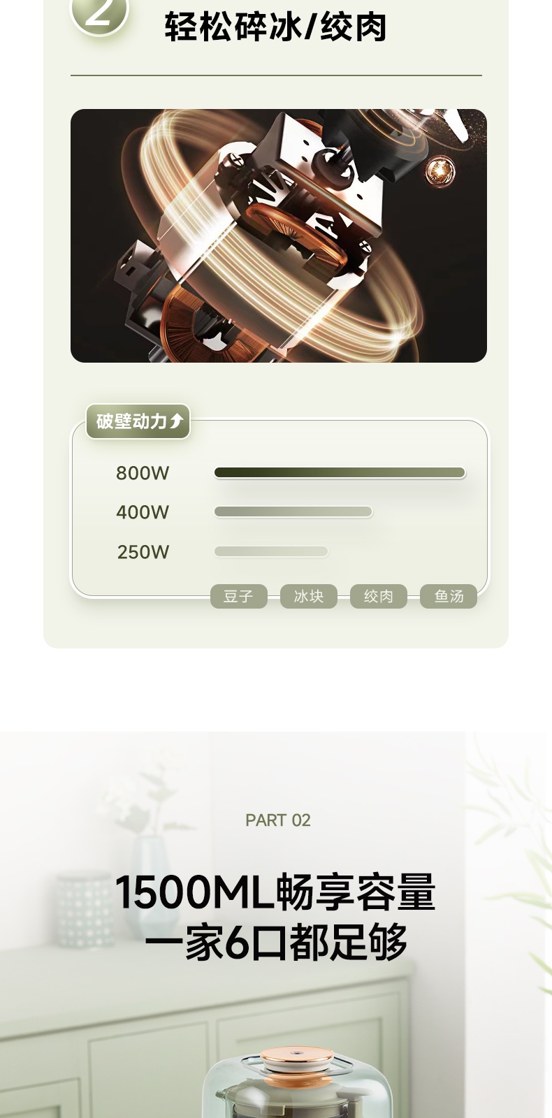 "*轻便 柔音 养生 *密闭隔音舱 最低53分贝 *触控彩屏 *细腻免滤 *十大菜单 *一键清洗 *可视化烹饪 *防烫大提手 *开盖自动停机保护 *多功能-十大菜单功能 *1~12小时预约 *食品级麦饭石陶瓷底盘,杜绝糊底易清洗 *底部4个防滑胶脚"" 十大菜单:果蔬、豆浆、米糊、杂粮粥、果仁露、花茶、 银耳羹、浓汤、燕窝、加热 包装配件:整机 说明书 电源线 清洁刷 量杯 预约时间可调:1~12h预约 搅拌档位可调:1~8档"