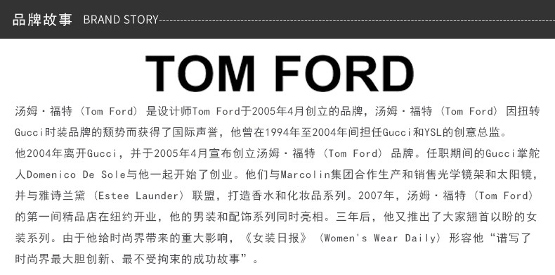 汤姆·福特 (Tom Ford) 是设计师Tom Ford于2005年4月创立的品牌,汤姆·福特 (Tom Ford) 因扭转Gucci时装品牌的颓势而获得了国际声誉,他曾在1994年至2004年间担任Gucci和YSL的创意总监。任职期间的 Gucci 掌舵人 DomenicoDeSole 与他一起开始了创业。他们与 Marcolin 集团合作生产和销售光学镜架和太阳镜,并与雅诗兰黛(EsteeLaunder)联盟,打造香水和化妆品系列。