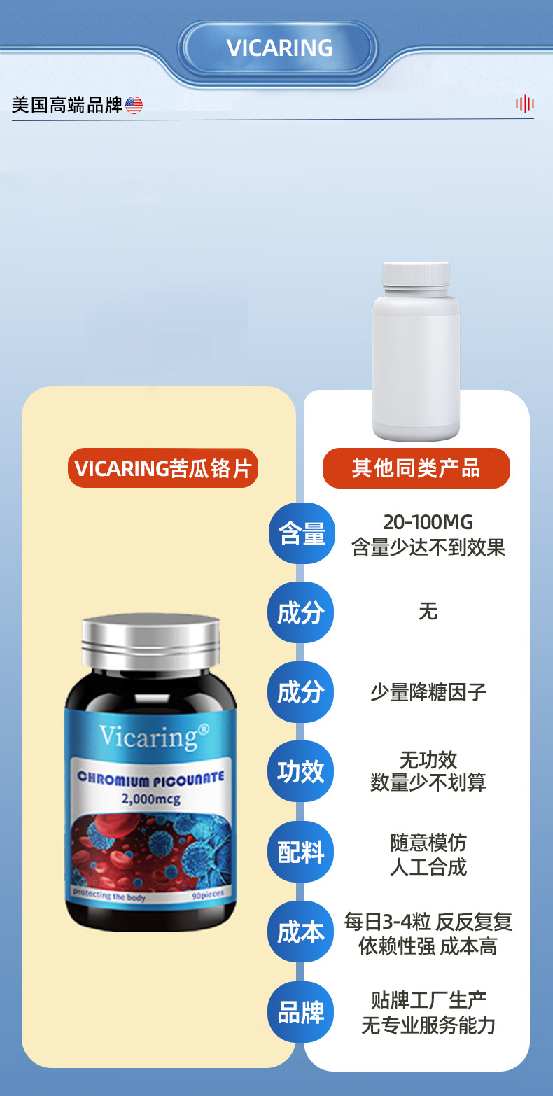 Vicaring是美国VICARING TRADING CO., LIMITED旗下膳食营养补充剂品牌,1995年由Jeffrey Solomon创立于洛杉矶,秉持“天然至上,健康为先”理念开发天然成分为主的产品线。品牌名称由Valuable(宝贵)、Ideal(理想)、Caring(关爱)构成,分别对应健康生活基石、提升人类健康水平愿景及用户健康优先原则。